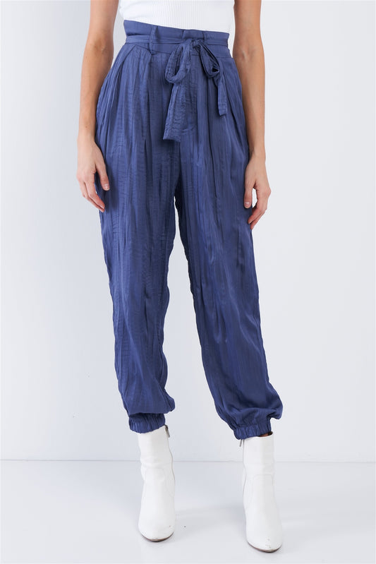 Crushed Satin Cinched Ankle Cuff Self Tie Waist Sash Pants