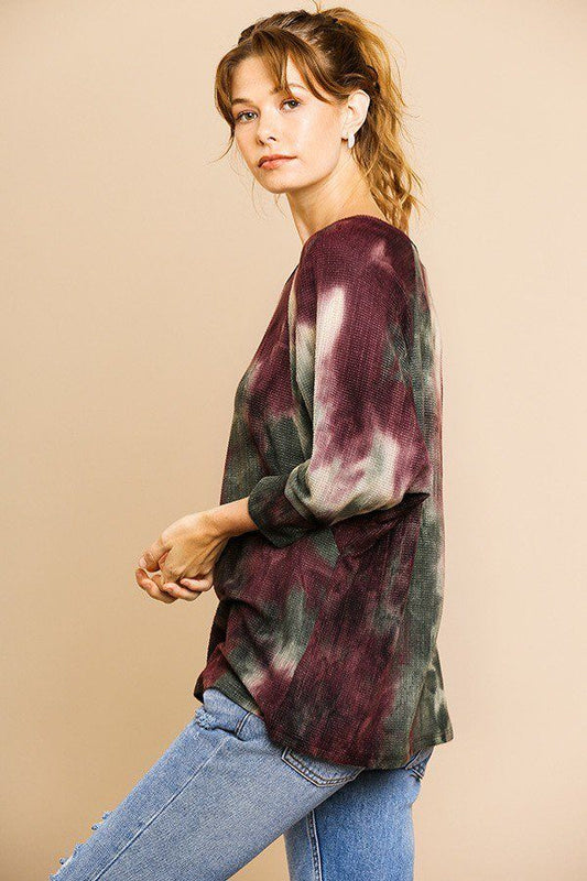 Tye Dye 3/4 Sleeve Waffle Knit Round Neck Top