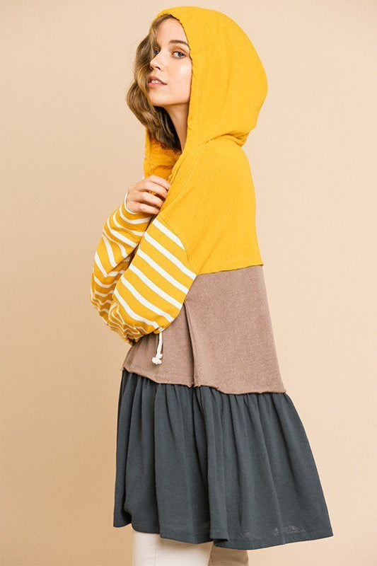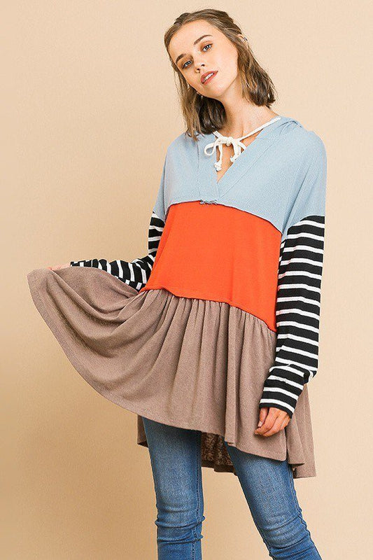 Striped Long Sleeve Color Blocked Hooded Tunic With Drawstring And Ruffle Hem
