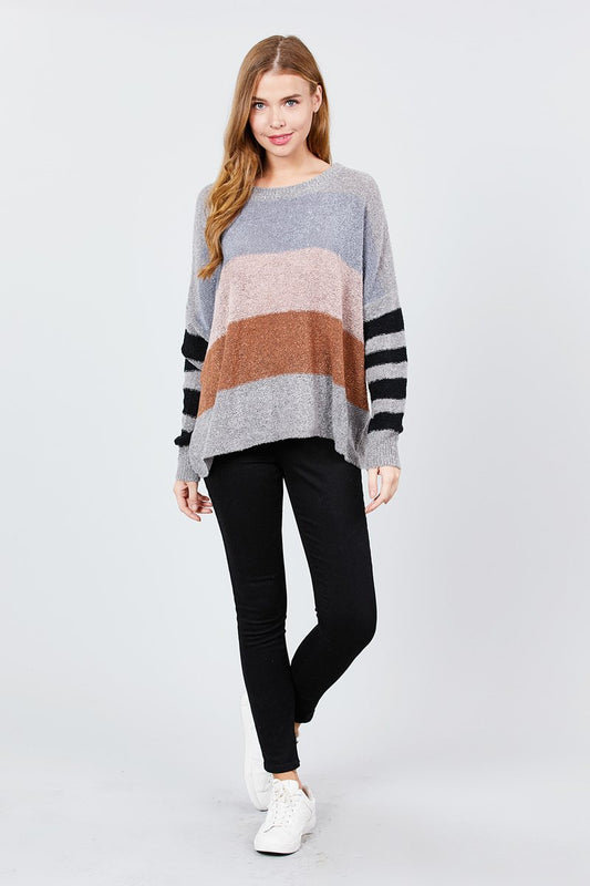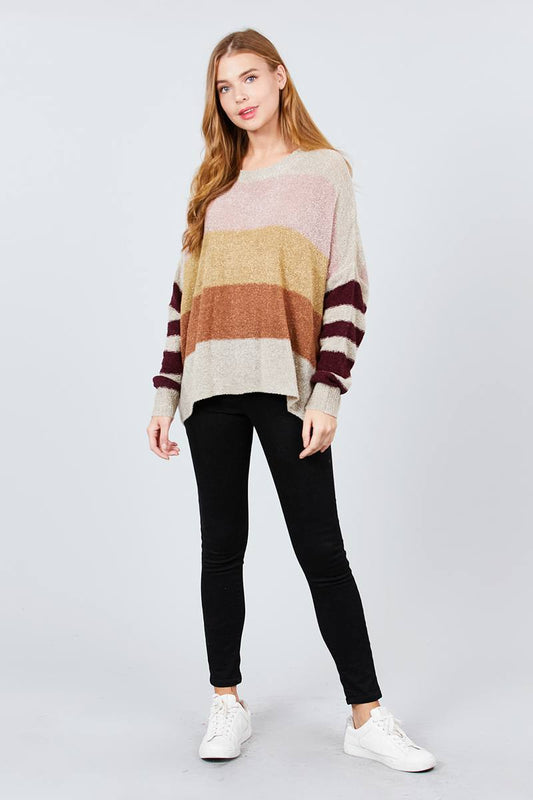 Long Dolman Sleeve Round Neck Multi Color Block Sweater