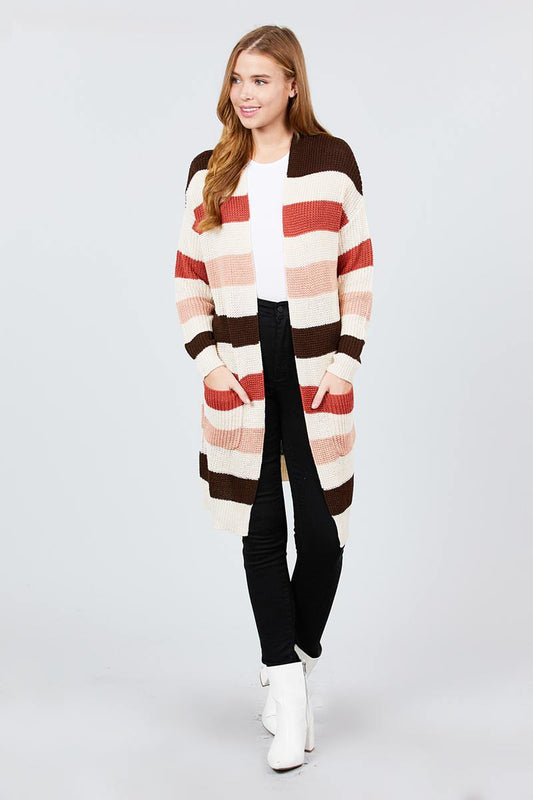 Long Sleeve W/two Pocket Color Block Sweater Cardigan