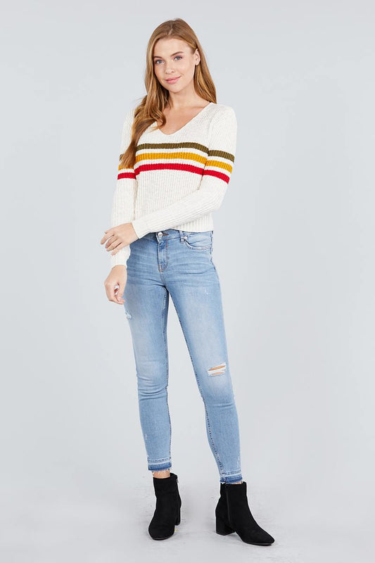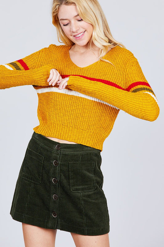 Long Sleeve V-neck Multi Stripe Crop Sweater