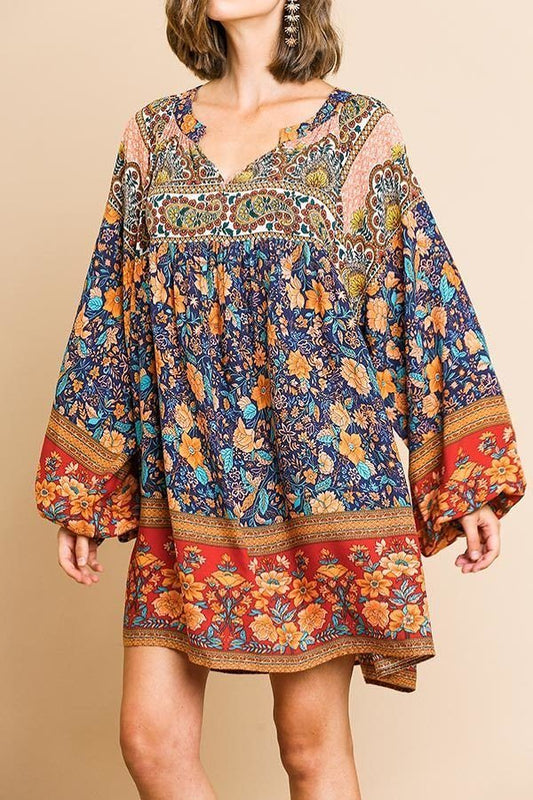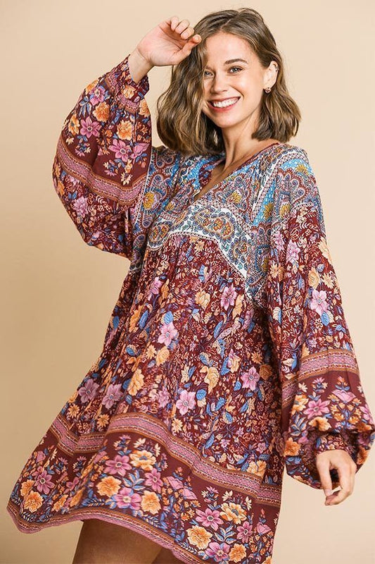 Floral Mixed Print Long Puff Sleeve Split Neck Dress