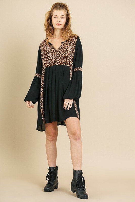 Animal Print Long Puff Sleeve Split Neck Babydoll Dress