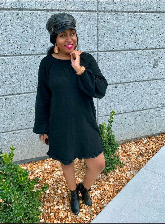 Linen Blend Long Puff Sleeve Round Neck High Low Dress