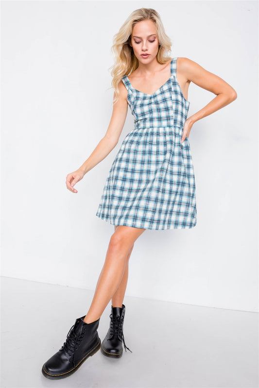 Blue Plaid Stripe Cut Out Back Bow Midi Sundress