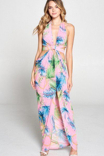 Short Sleeve V-neck Button Down Belted Print Woven Maxi Dress
