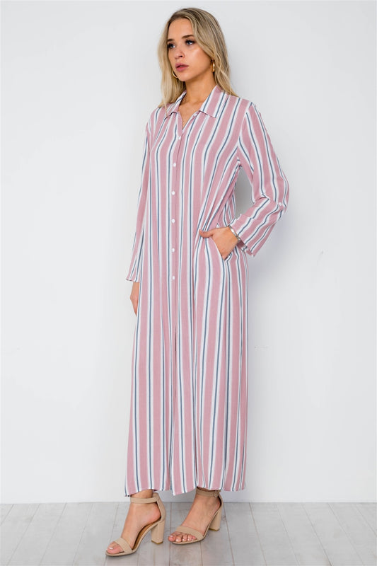 Mauve Multi Stripe Button Down Dress Maxi Blouse Shirt