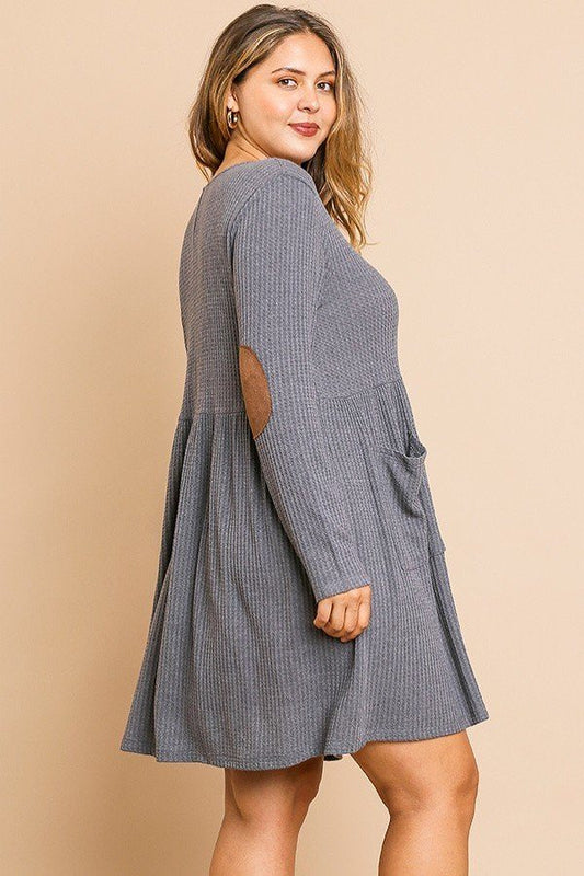 Waffle Knit Long Sleeve Round Neck Faux Button Front Babydoll Dress