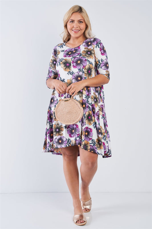 Plus White Floral 3/4 Sleeve Midi Dress