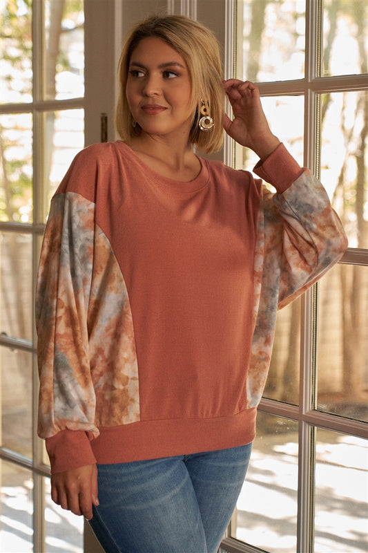 Plus Size Coral Tie-dye Long Sleeve Relaxed Round Neck Top