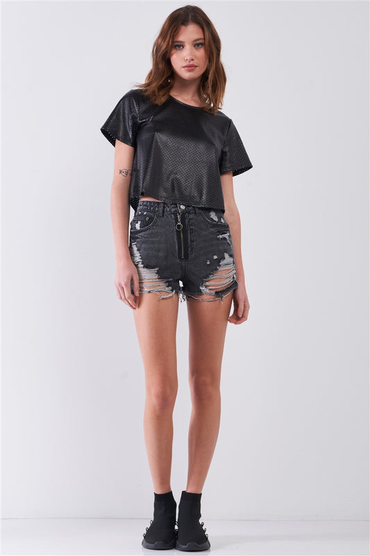 Black Vegan Leather Laser Cut Round Neck Wide Short Sleeve Cropped Top