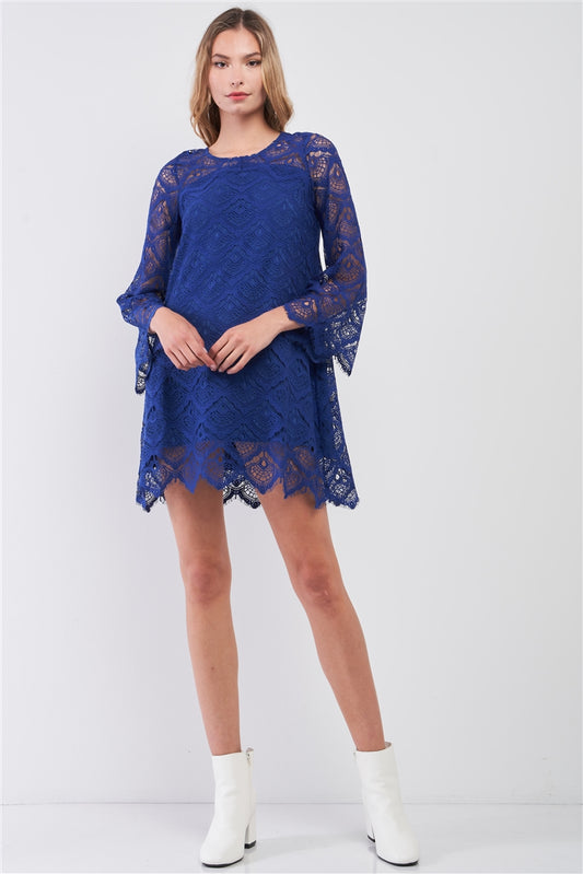Royal Blue Crochet Lace Round Neck Long Bell Sleeve Zigzag Hem Loose Fit Mini Dress