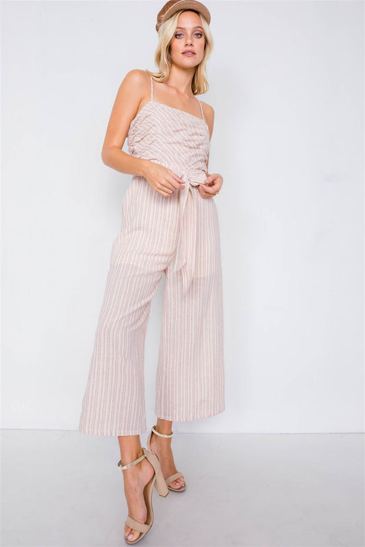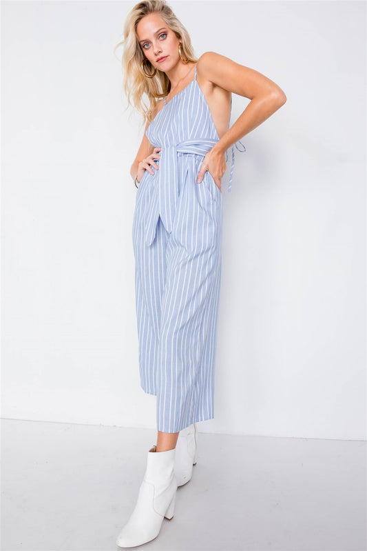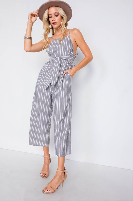 Stripe Front Tie Waist Band Open Back Jumpsuit