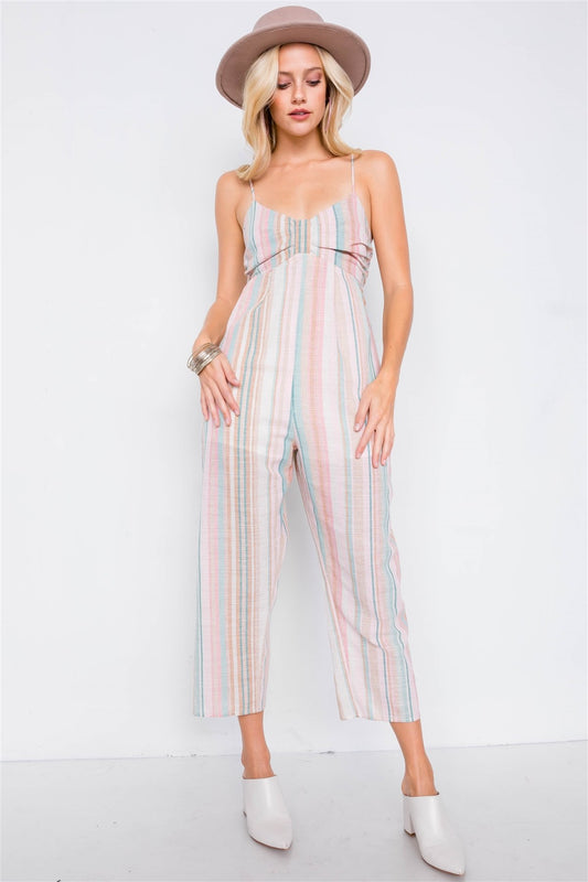 Multi Stripe Ribbon Shaped Front Smocking Back Jumpsuit