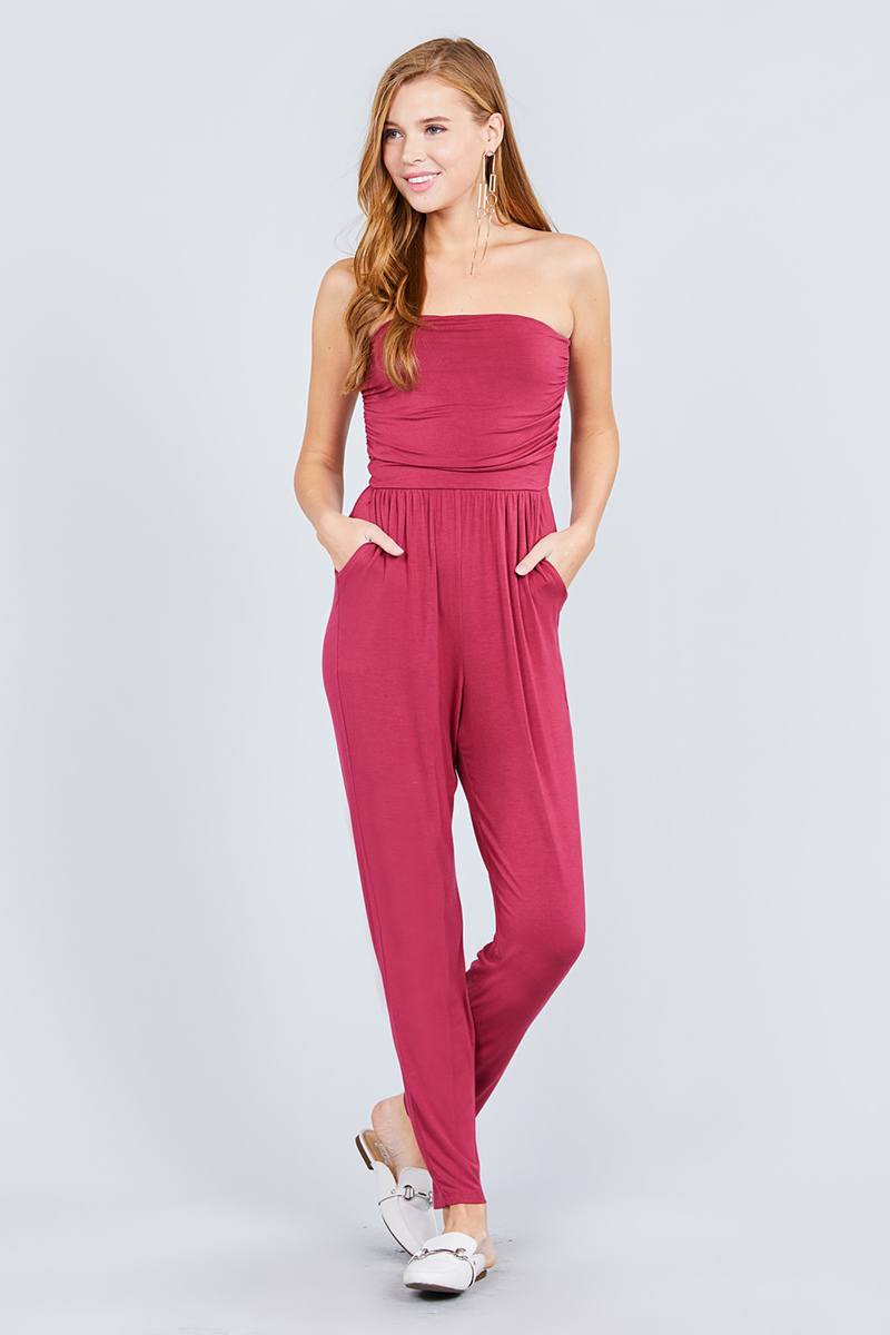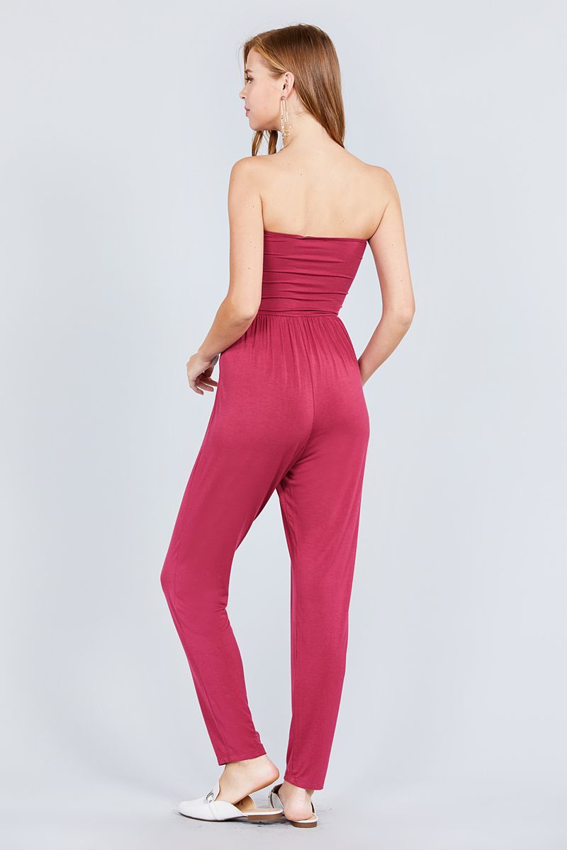 Strapless Tube Top W/front Slanted And Pocket Rayon Spandex Jumpsuit
