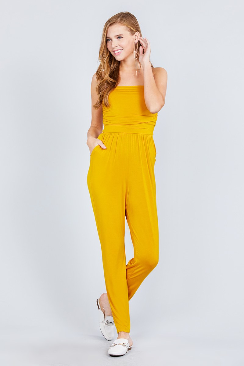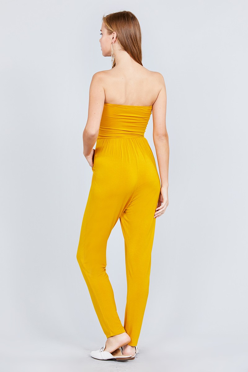 Strapless Tube Top W/front Slanted And Pocket Rayon Spandex Jumpsuit