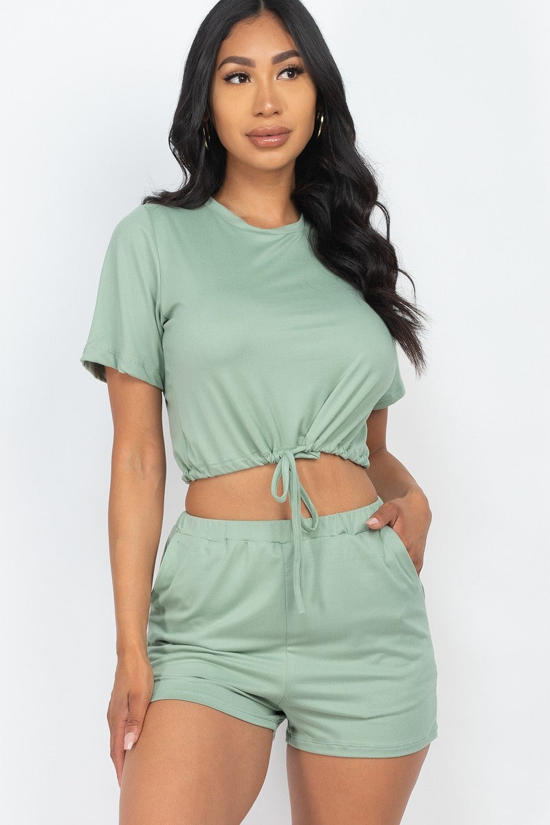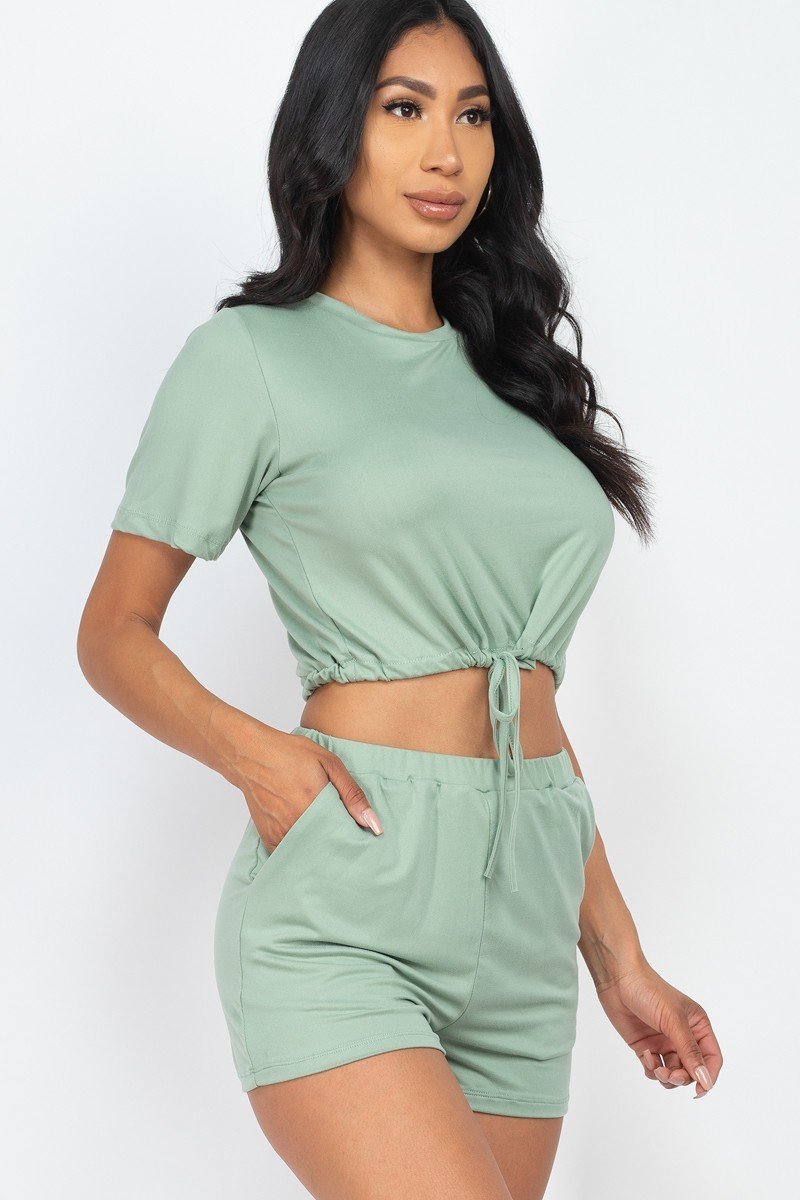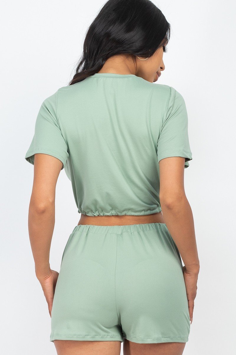Adjustable front tied crop top & shorts casual summer sets. Stretch knit. Short Sleeve. Solid