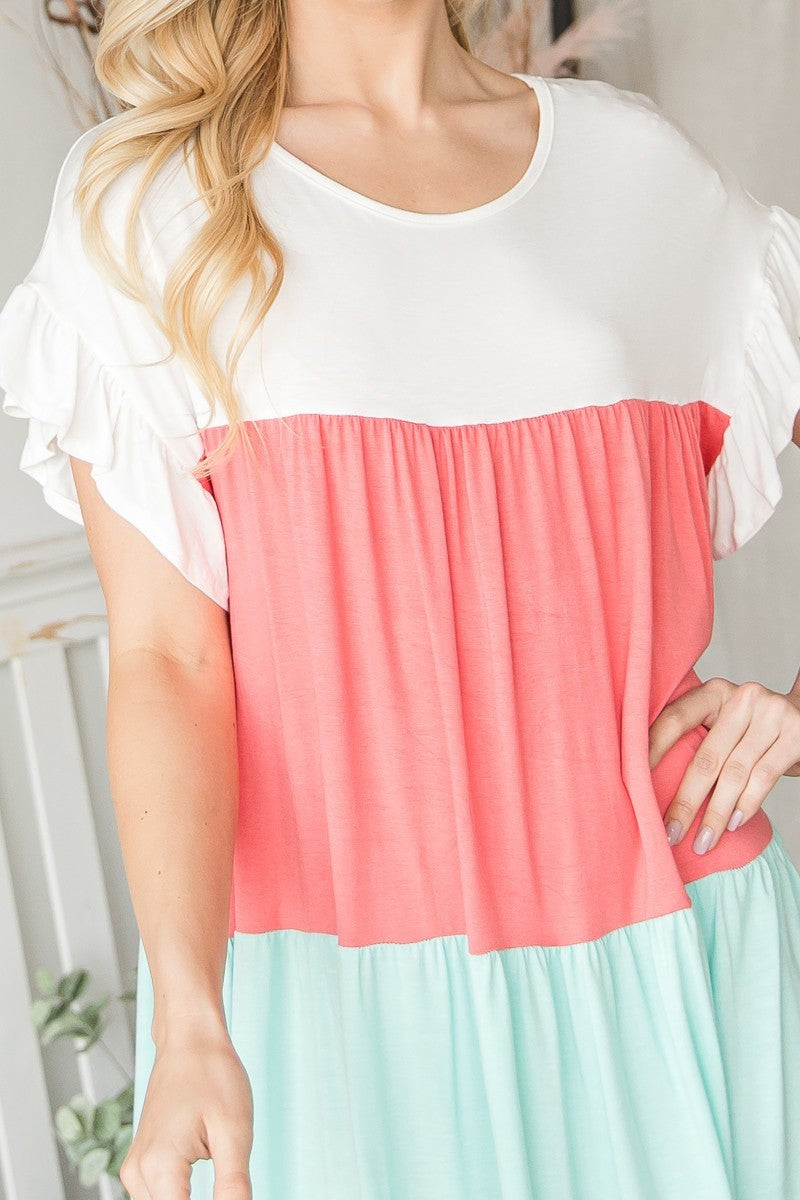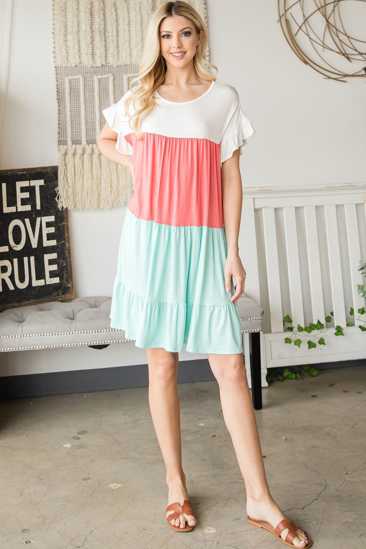 This cute tiered mini dress comes in a beautiful three colored block and features mini ruffles around the arm sleeves. Keep it casual, comfortable, and stylish
