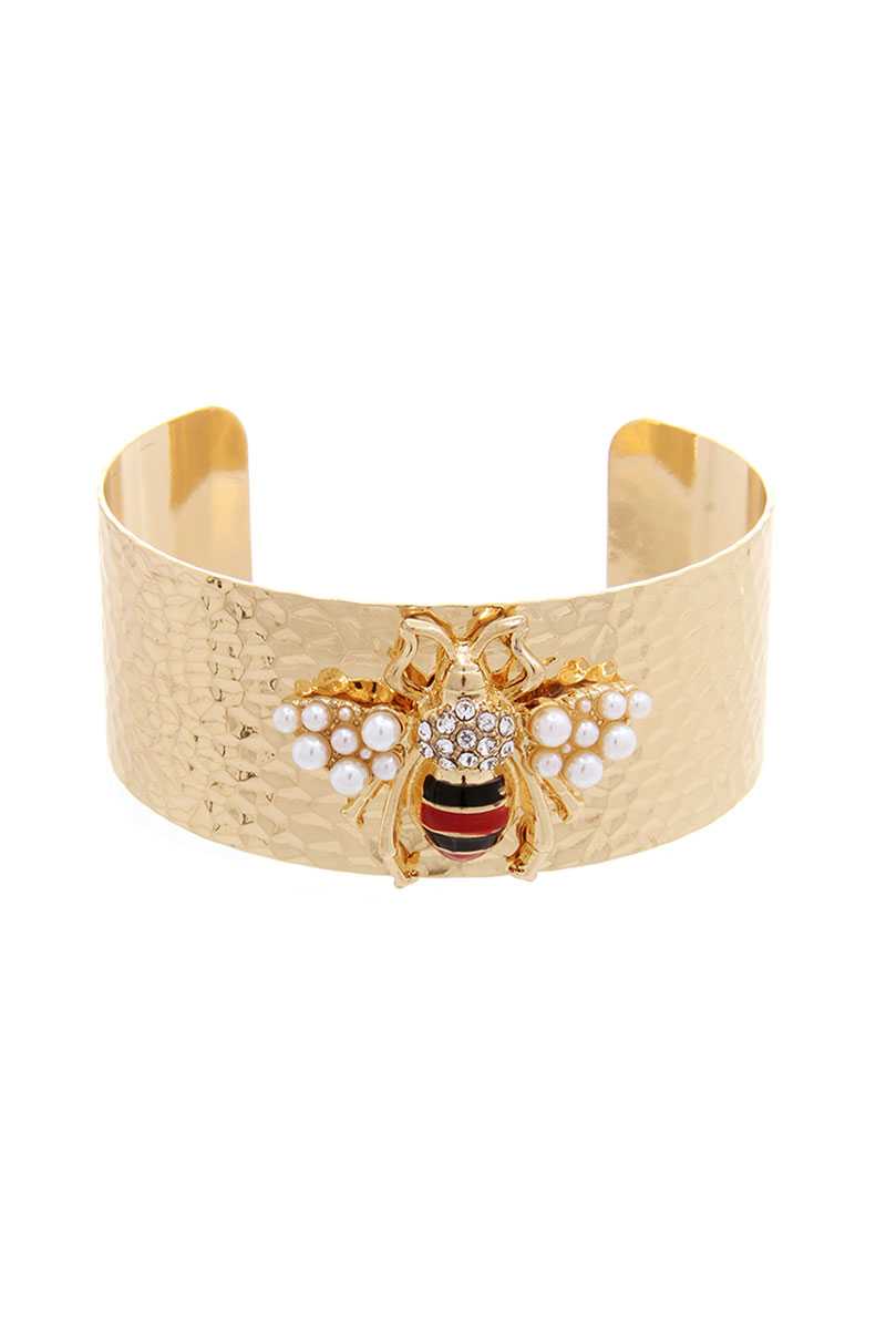 HAMMERED METAL WITH PEARL BEE OPEN CUFF BRACELET