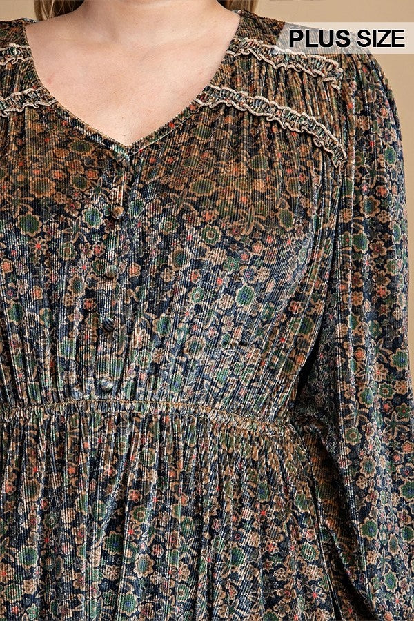 Introducing our enchanting Printed Velvet V-Neck Dress with Button Front Detail—a timeless wardrobe piece that effortlessly combines sophistication and comfort.