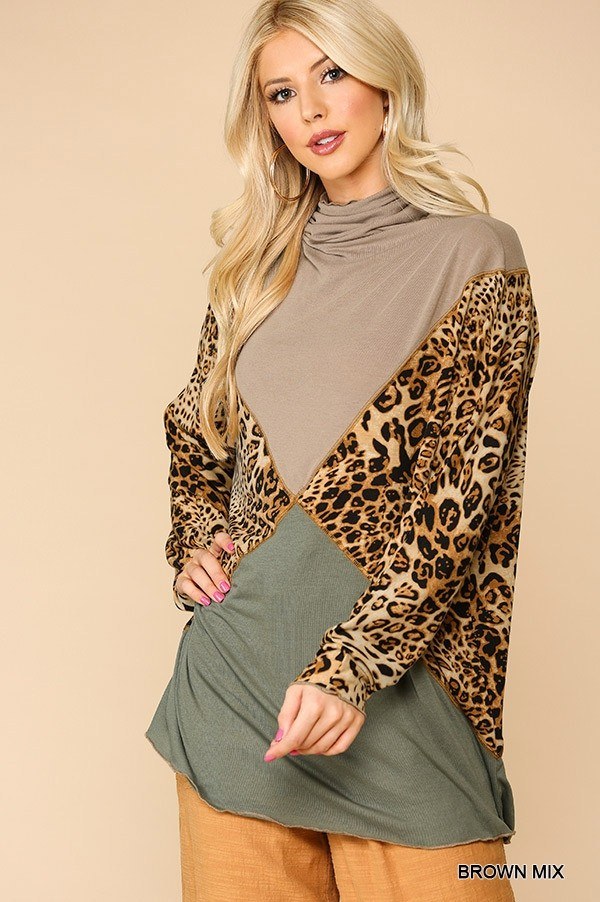 Solid And Animal Print Mixed Knit Turtleneck Top With Long Sleeves
