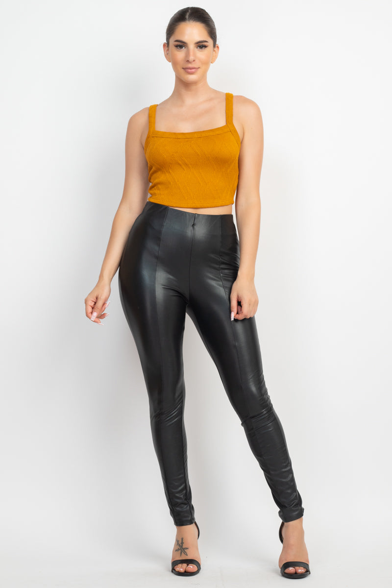 A set of ribbed fashion tops in a geometric pattern featuring a sleeveless inner top, a square neckline, and cropped hem paired with a long puff sleeves blazer in a scoop neckline, and a button-front closure.