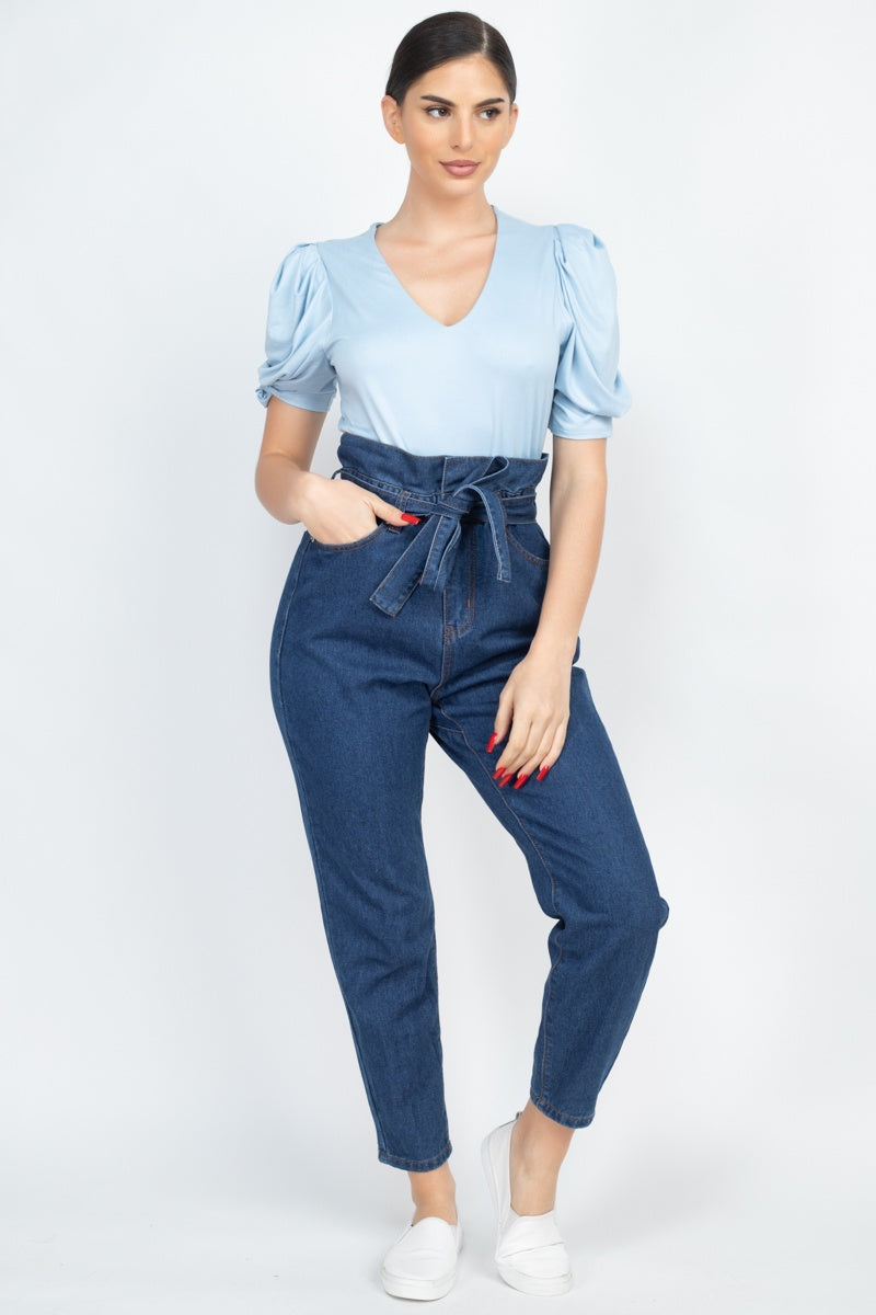 A woven pair of denim jeans featuring a zip fly closure with an elasticized paper bag high waist, front pockets, front self tie, a loose fit, cuffed hem, and a capri length.