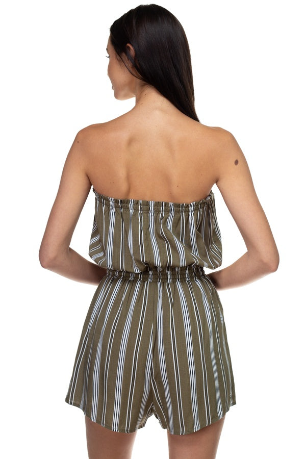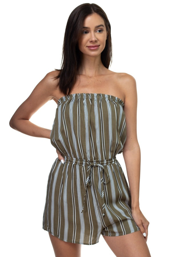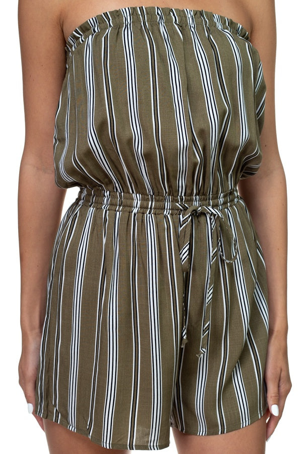 A woven romper, an allover stripe pattern design, a sleeveless cut, an elasticized straight neckline, a smocked waistline with self-tie, and a cropped hem