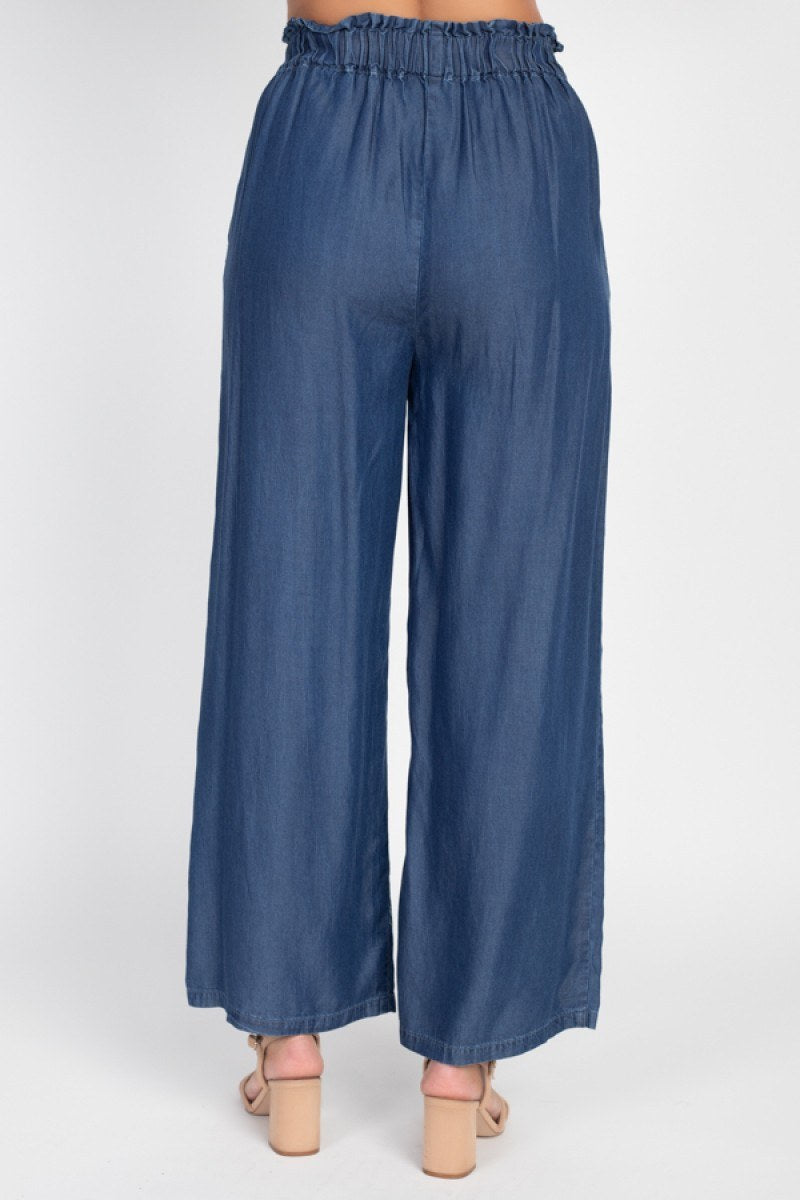 A woven pair of pants featuring a denim wash, an elastic waist, waist tie, and a wide leg fit.