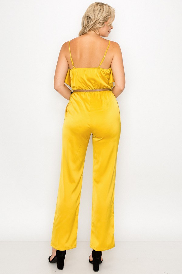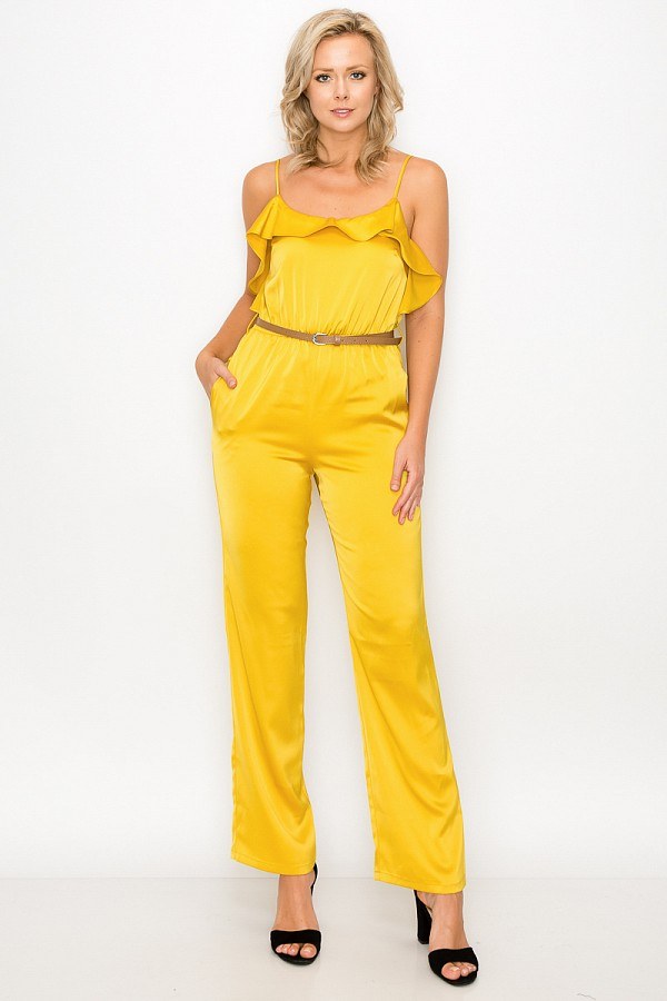 A sheeny woven jumpsuit featuring a scoop neckline with ruffle trim, adjustable cami straps, a removable belt with belt loops, front slanted pockets, a straight leg, and a full length
