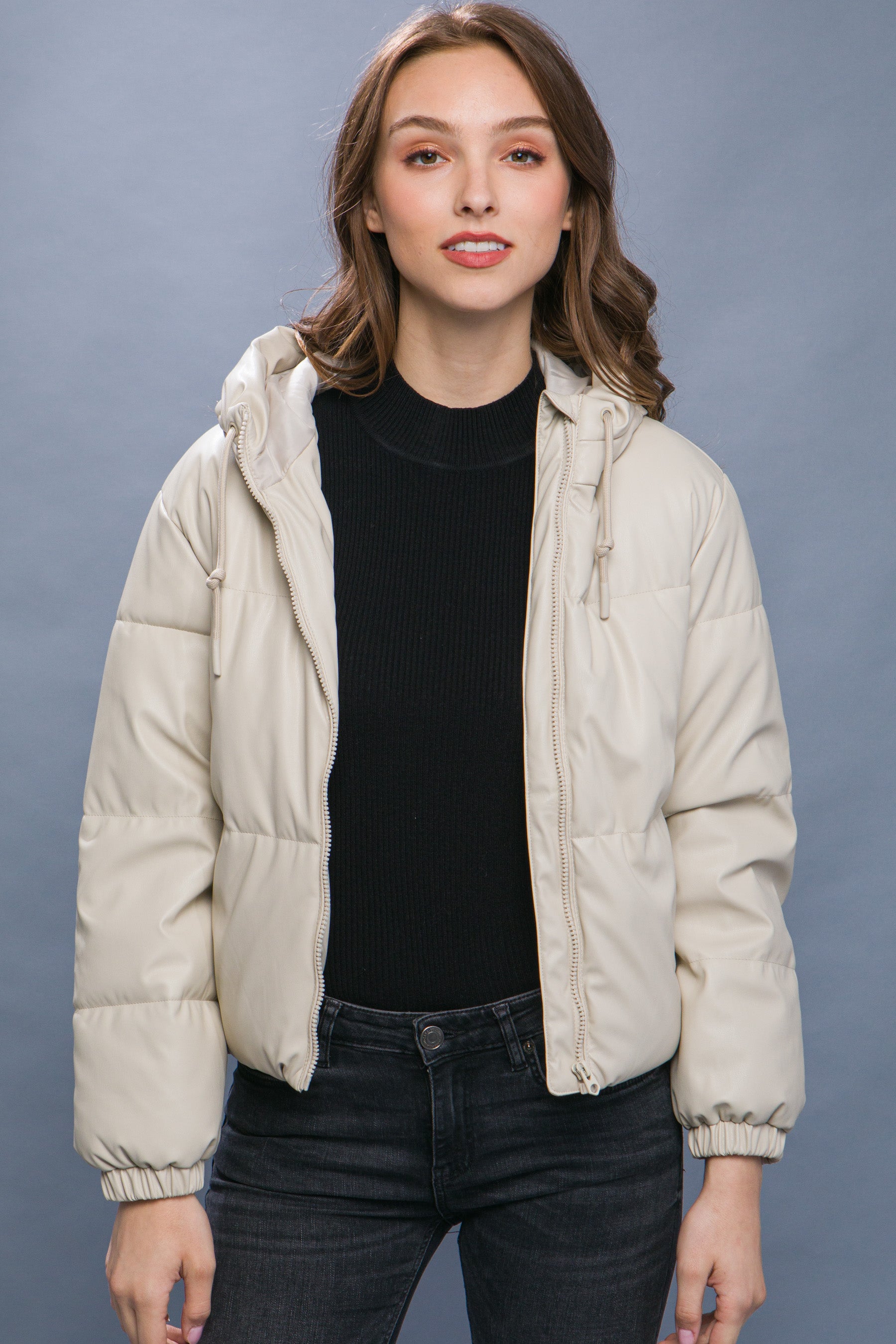 Why Choose the PU Faux Leather Zipper Hooded Puffer Jacket in Cream?