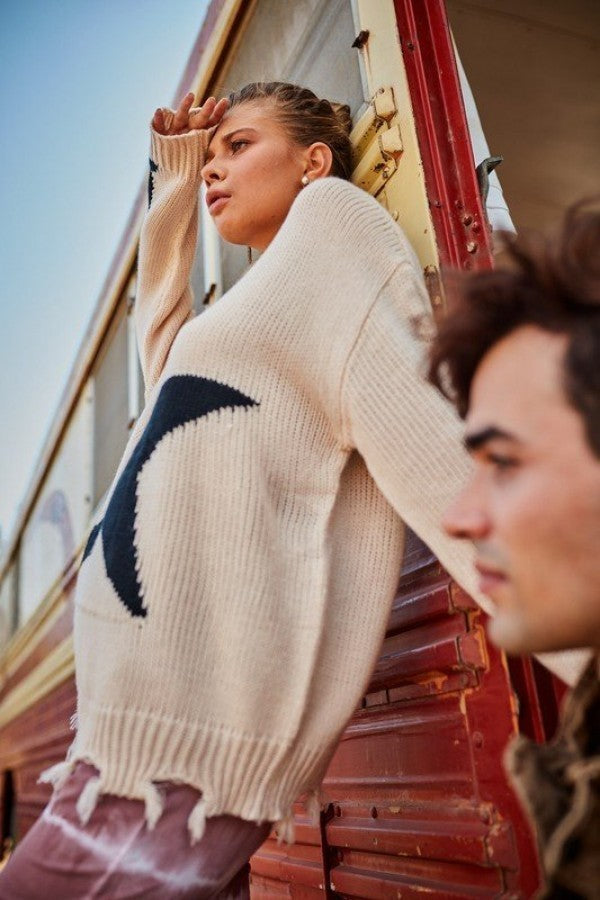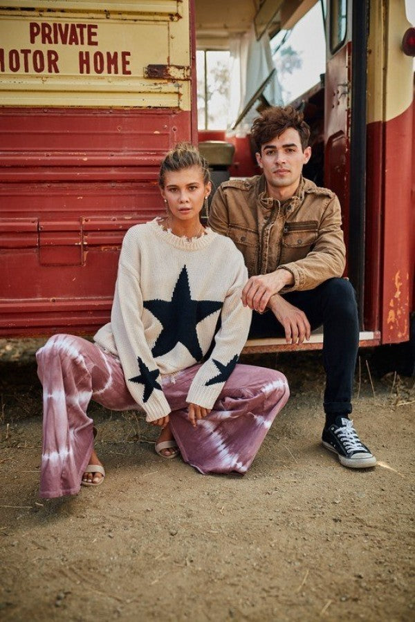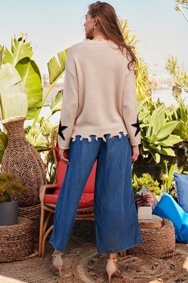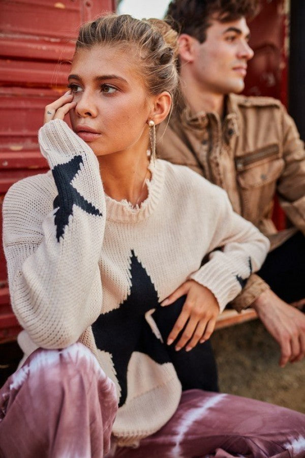 Distressed Round Neck Long Sleeve Star Print Loose Fit Sweater