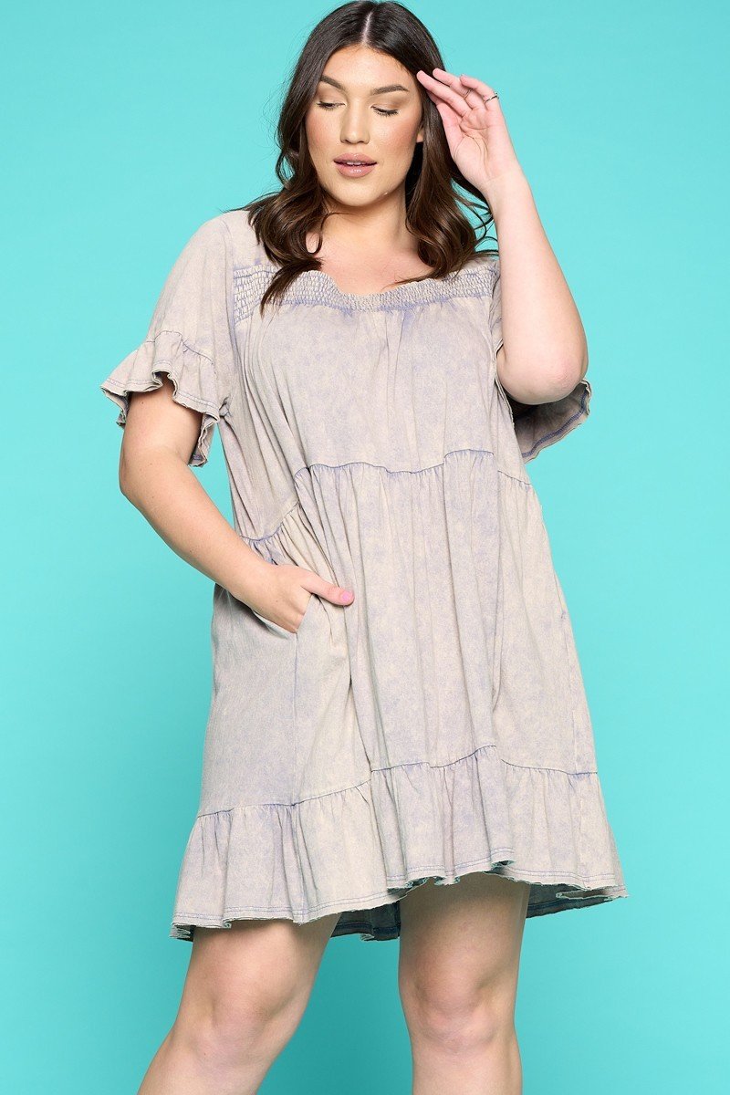 Solid washed knit tiered mini dress featuring a smocked square neckline, ruffled short sleeves and smock