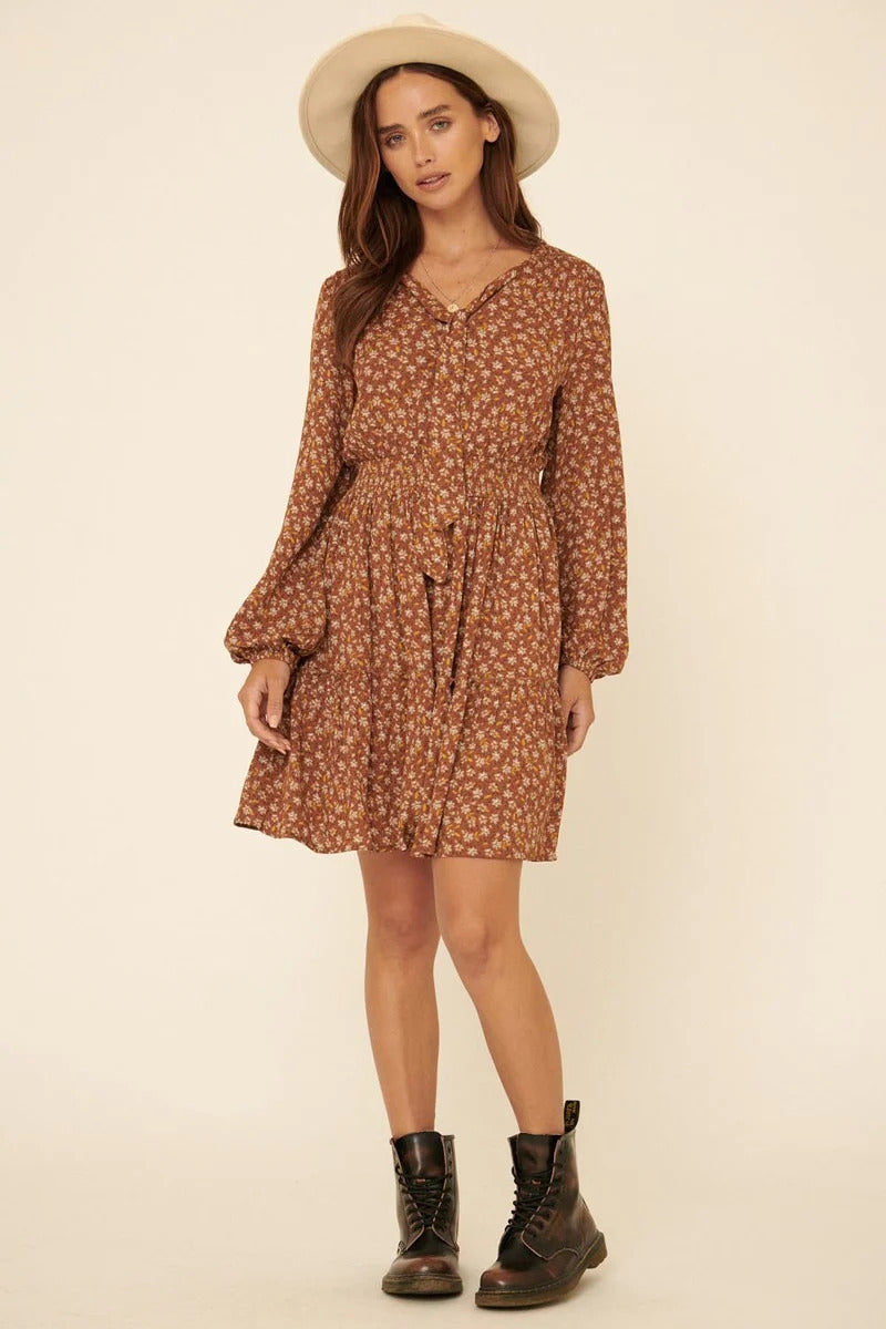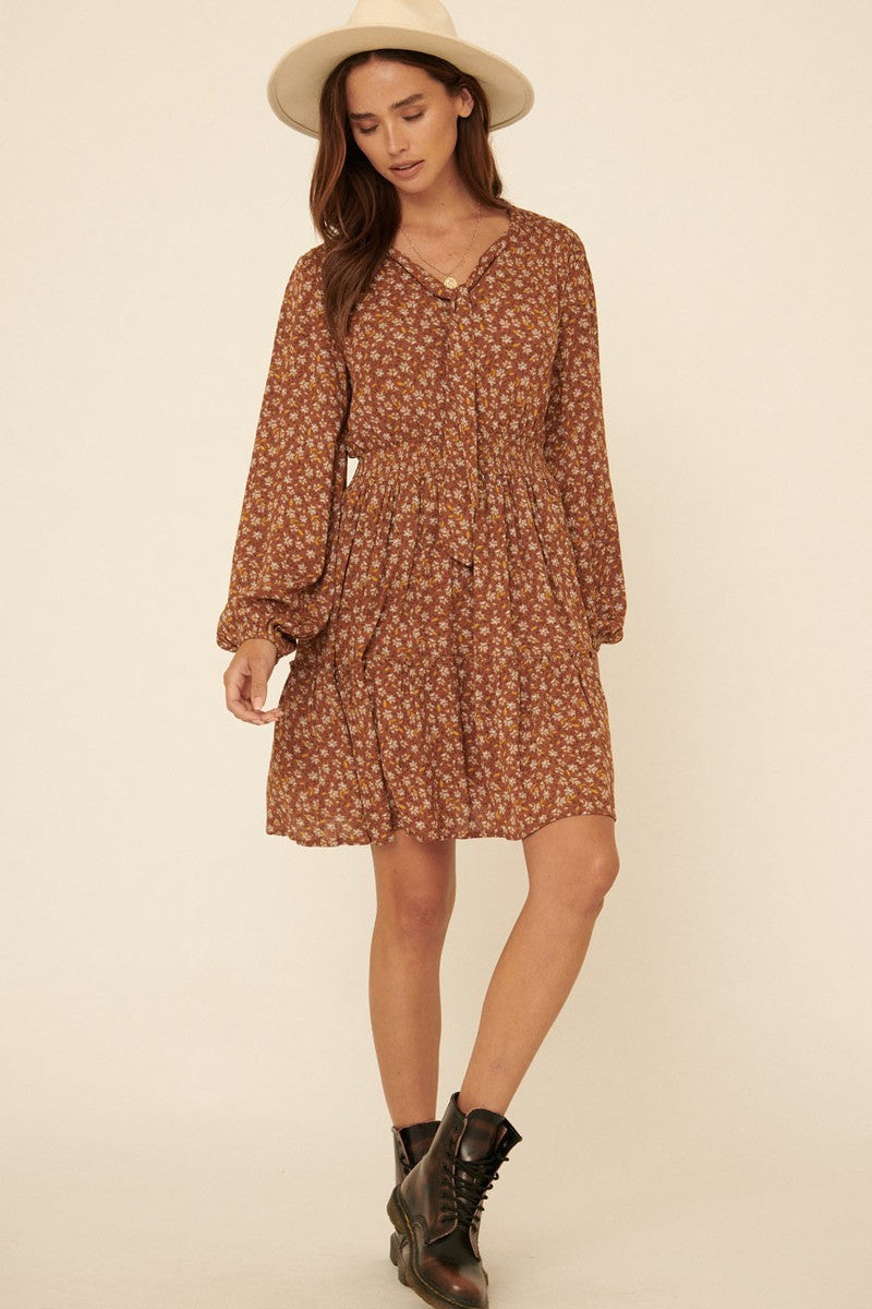 V neck with tie. Long bishop sleeves. Smocked elastic waist. Flared tier skirt. Thigh-length.