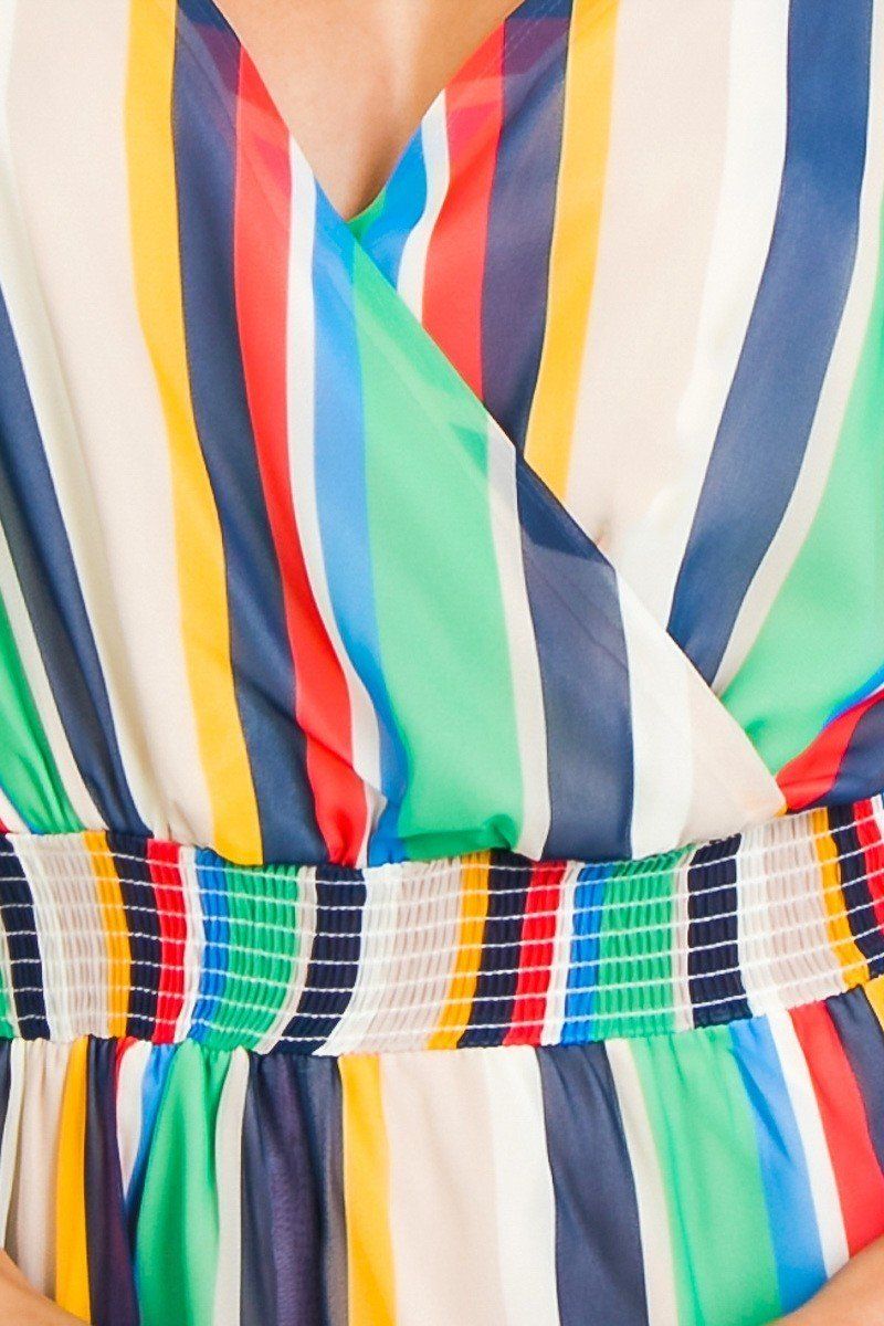 A striped surplice romper featuring a smocked waistband and ruffled inserts.