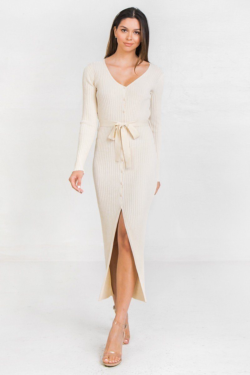 A ribbed sweater knit maxi dress featuring V neckline, self sash belt, button down with front slit