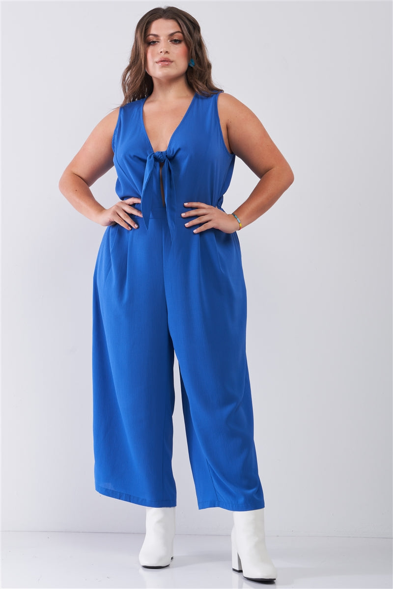 Plus Size Sleeveless V-neck Self-tie Front Detail Wide Leg Jumpsuit