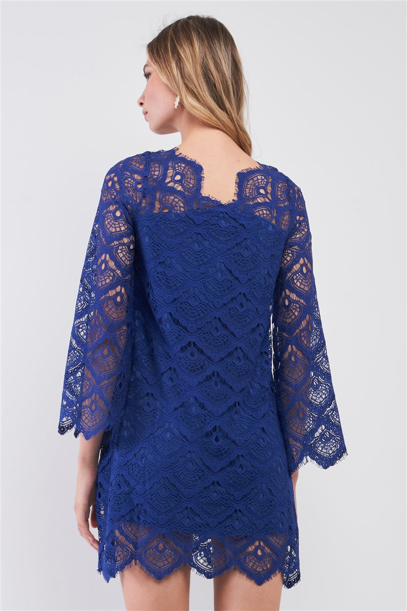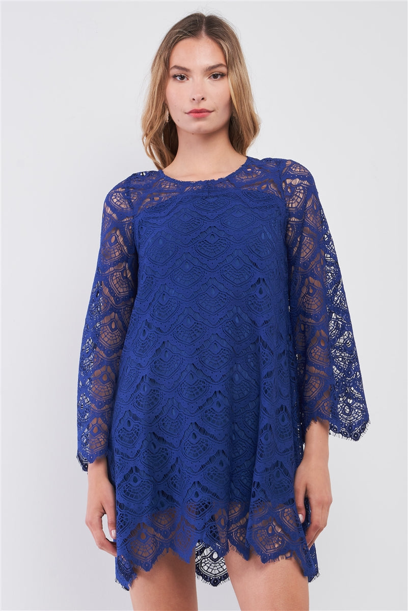 Royal Blue Crochet Lace Round Neck Long Bell Sleeve Zigzag Hem Loose Fit Mini Dress