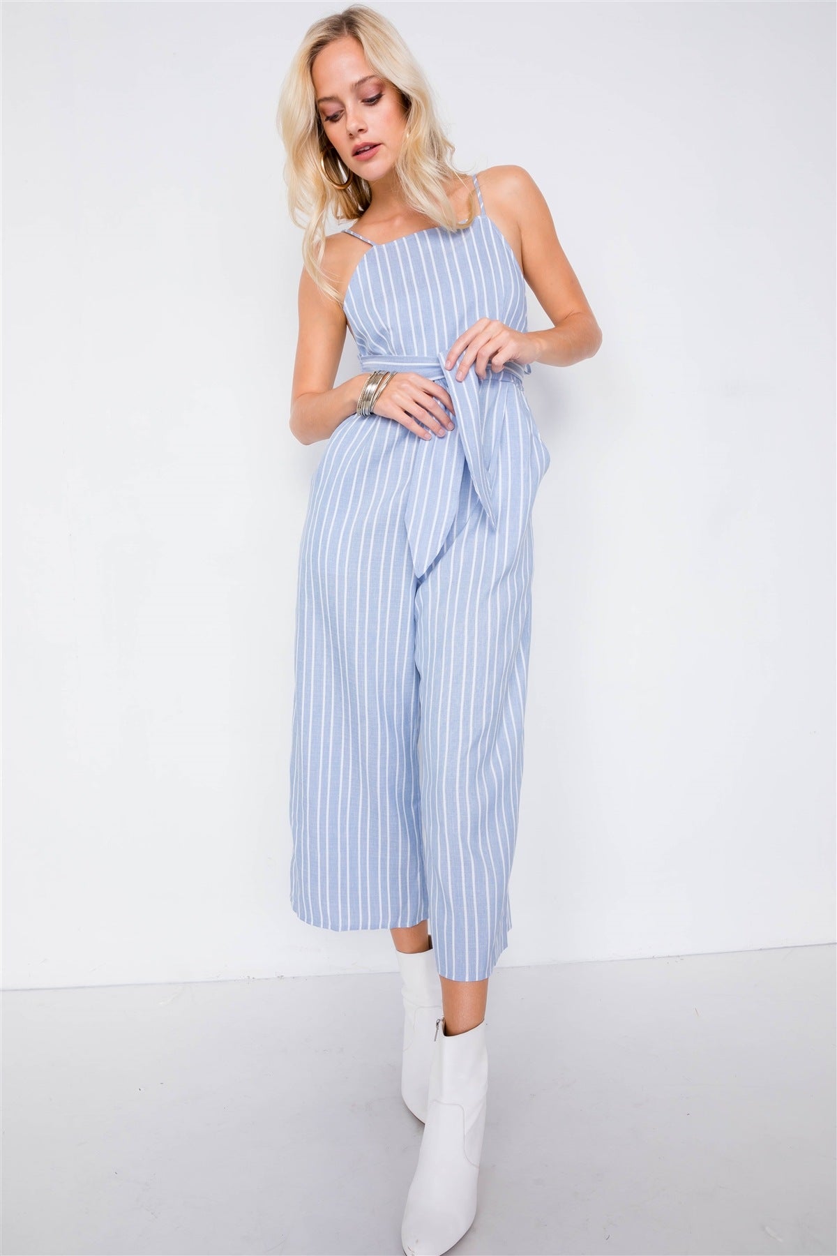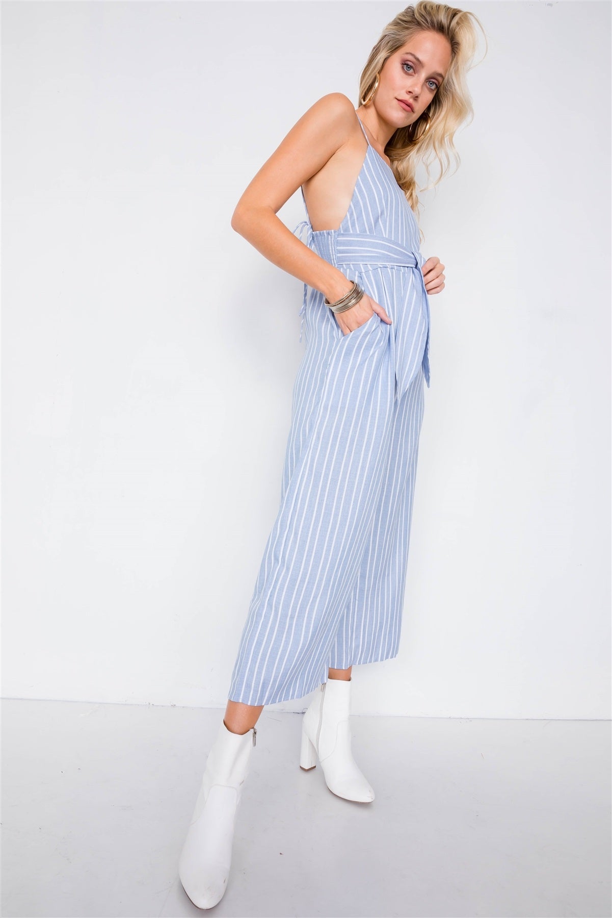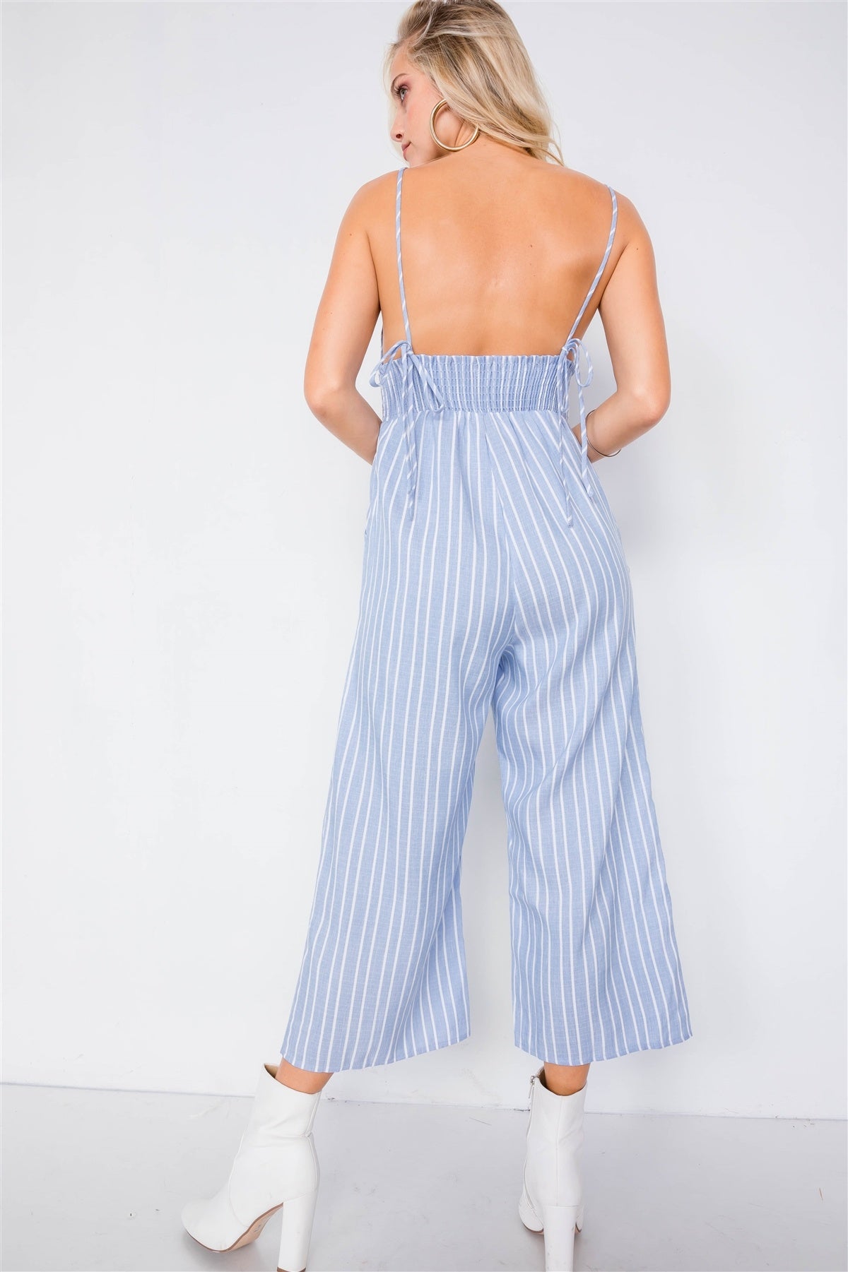 Stripe Front Tie Waist Band Open Back Jumpsuit