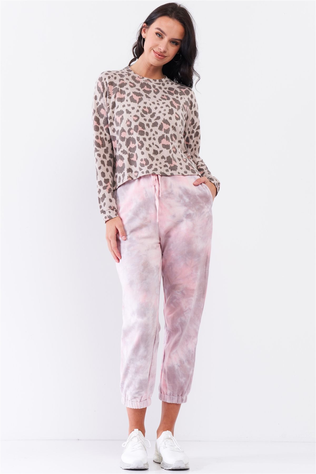 Taupe and pink, leopard print, crew neckline, long sleeve, uneven front and back length, relaxed fit, unlined, slight stretch, comfy, loungewear, soft to touch, activewear, casual, basic, fall/winter collection