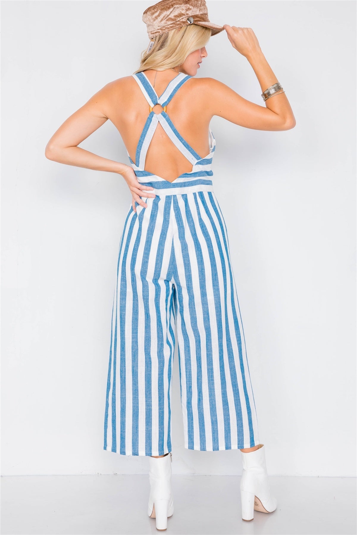 Blue Linen Stripe Button Down Wood Ring Jumpsuit