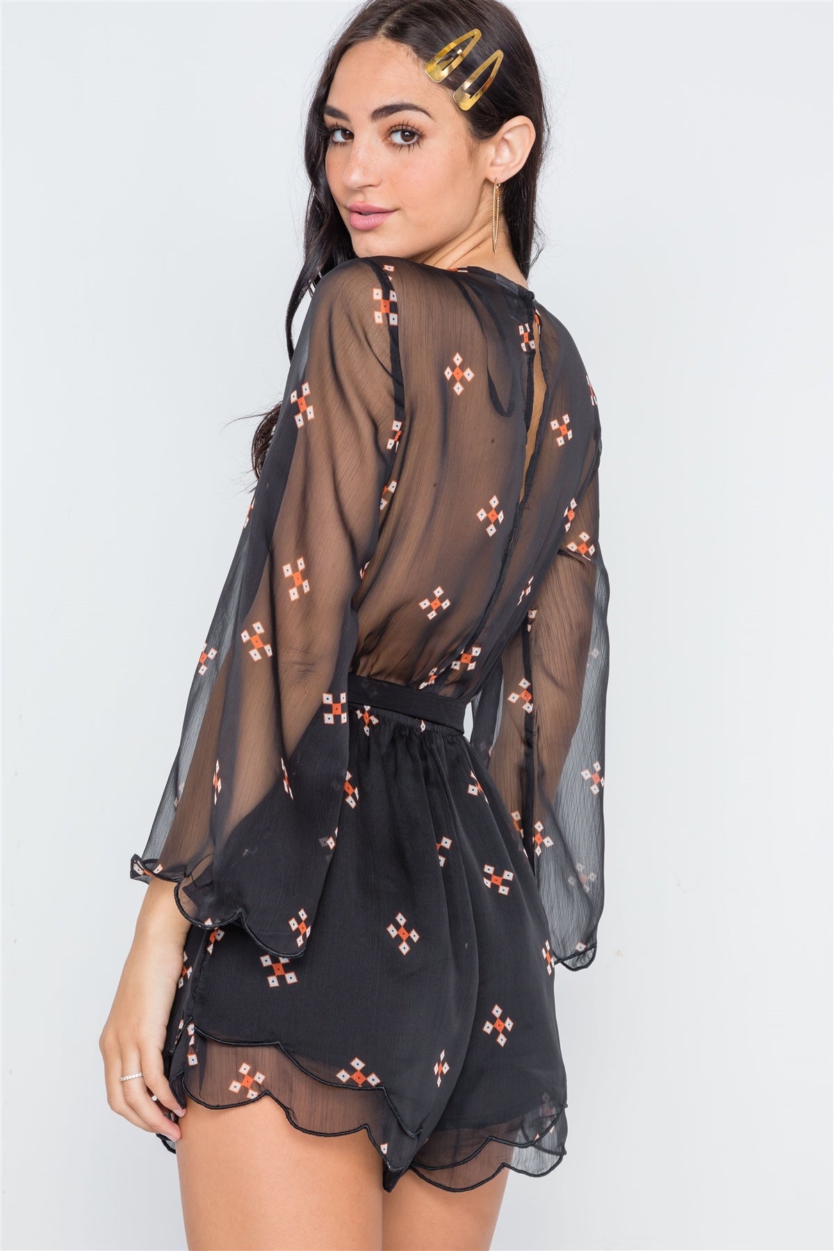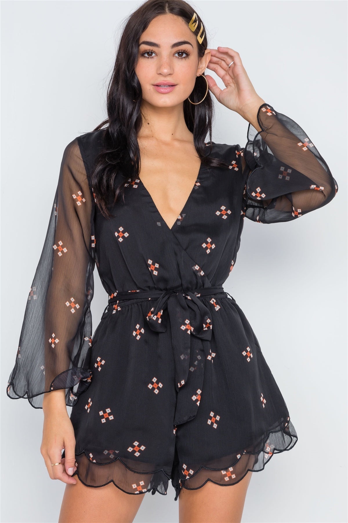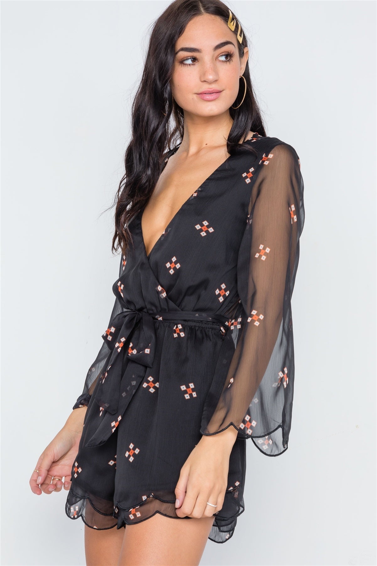 Black Chiffon Surplice Neck Long Sleeve Romper
