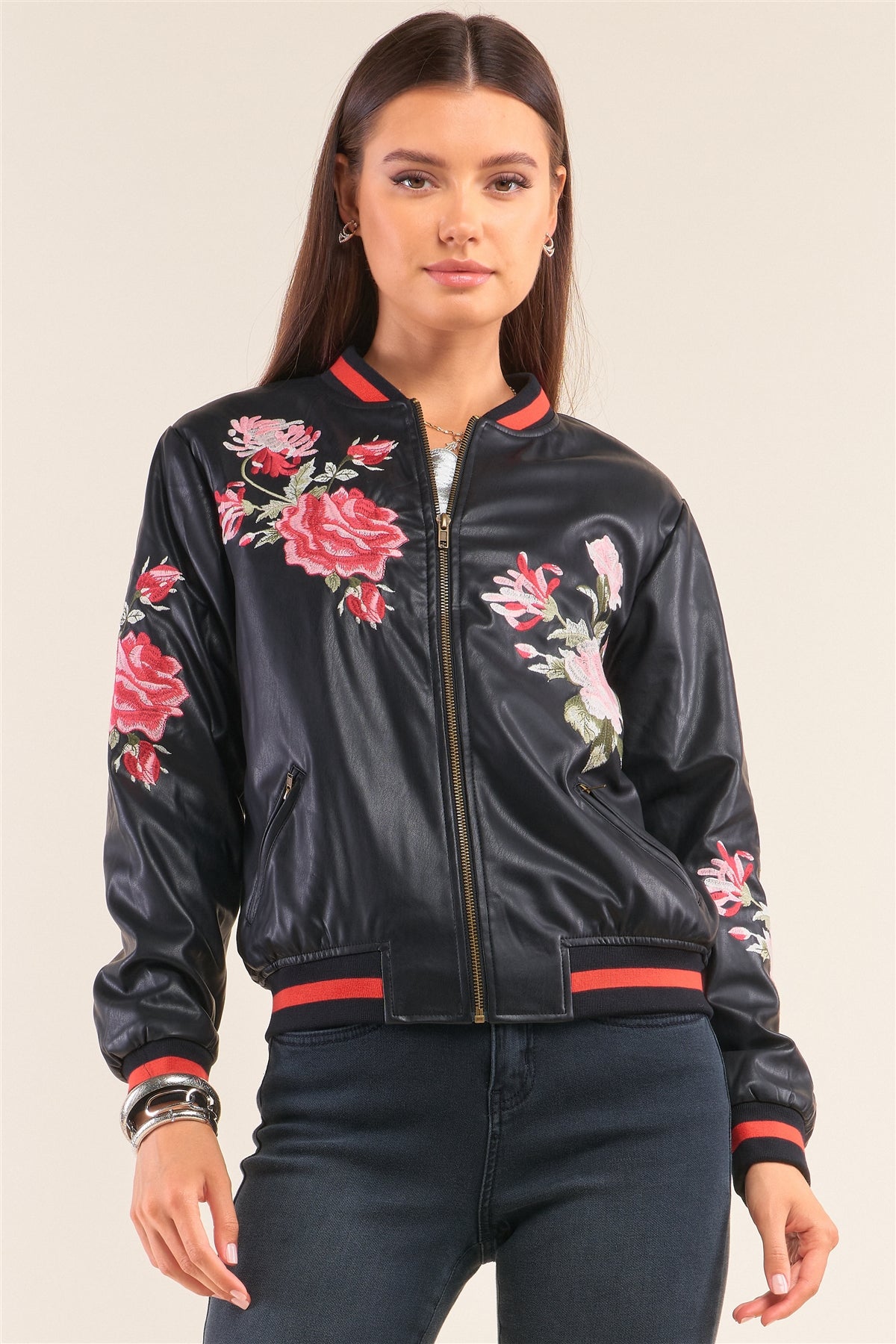 Black, vegan leather, rose floral pattern embroidery on sleeves and chest, center zipper fly closure, side zipper pockets, stretchy black and red striped sleeve, collar and bottom hem, quilted lining, semi-stretch overall, regular fit, casual, stylish, bomber style, fall/winter collection