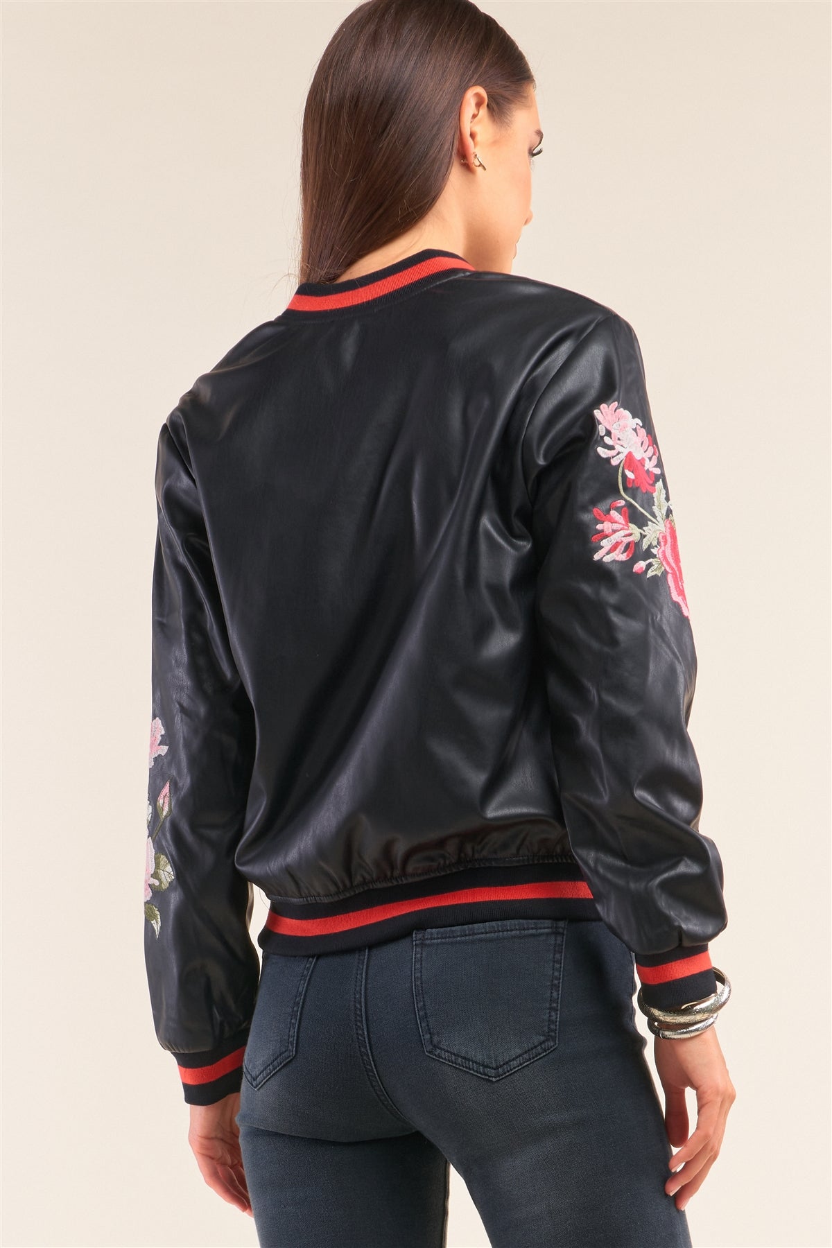 Rosa Black Vegan Leather Floral Embroidery Striped Hem Bomber Jacket
