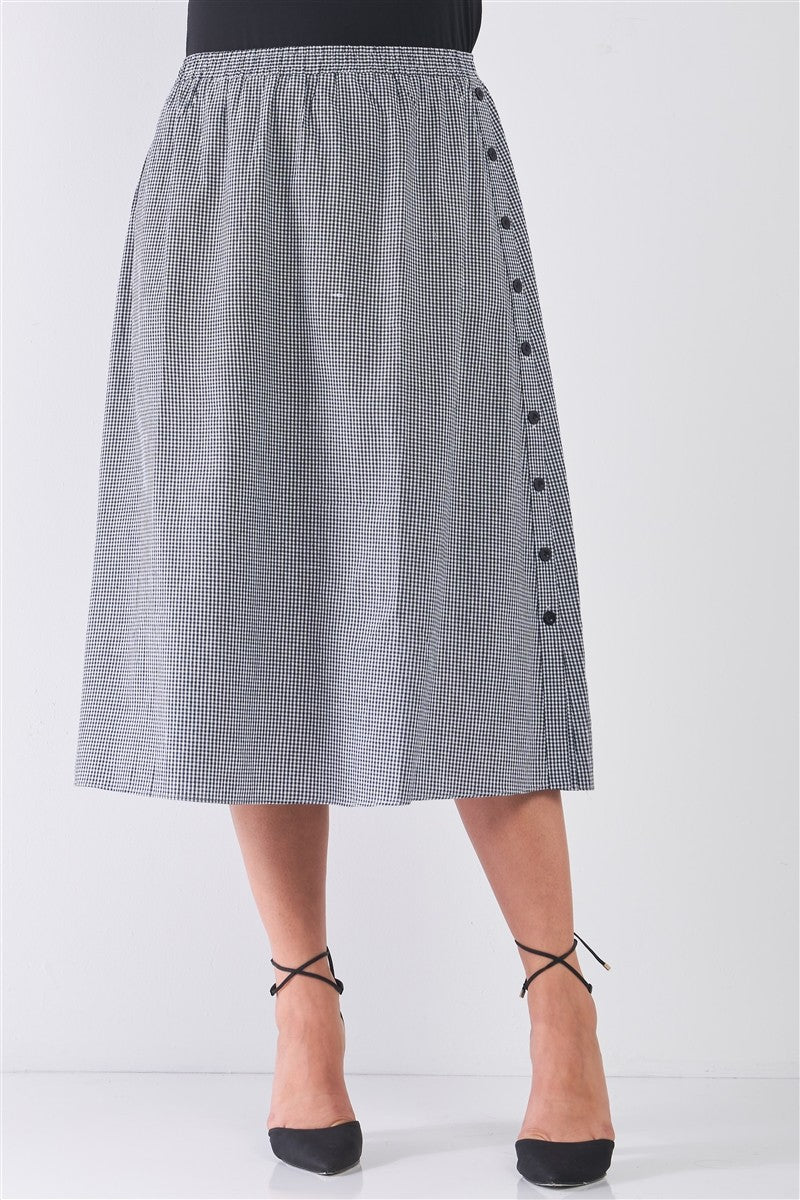 Plus Size Black Gingham Print Side Button Midi Skirt