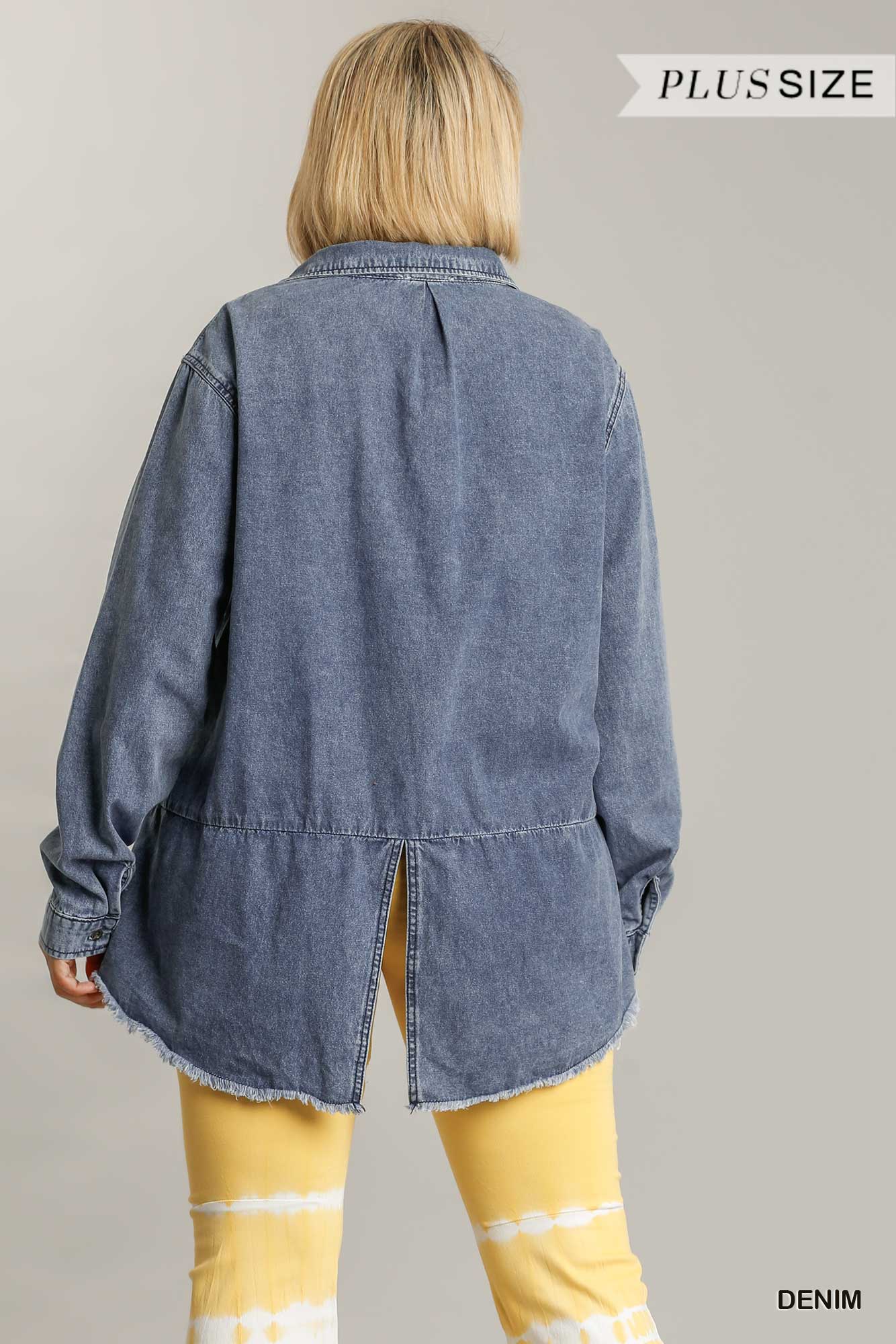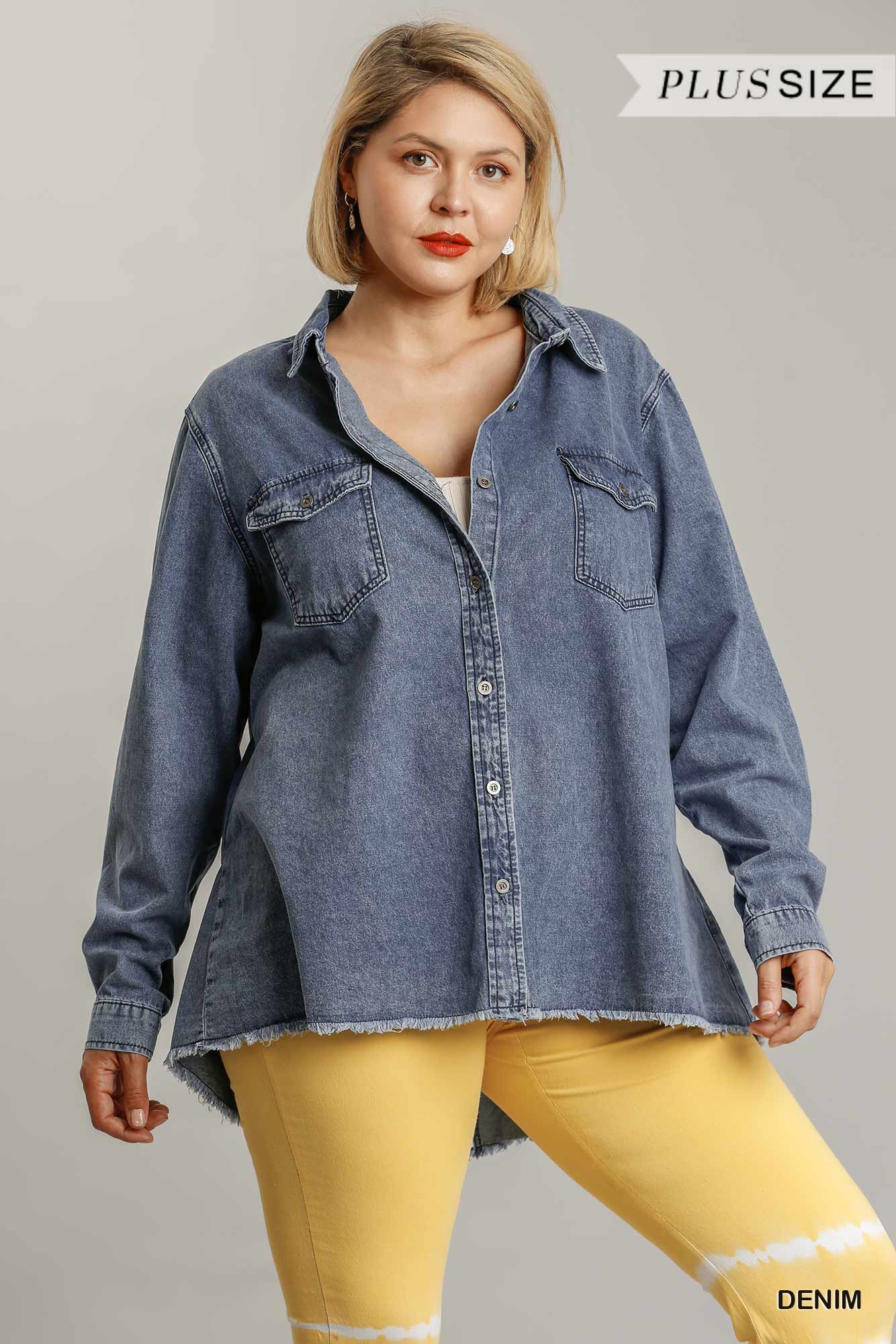 Chest Pockets Collar Button Down Denim Jacket with Unfinished High Low Hem