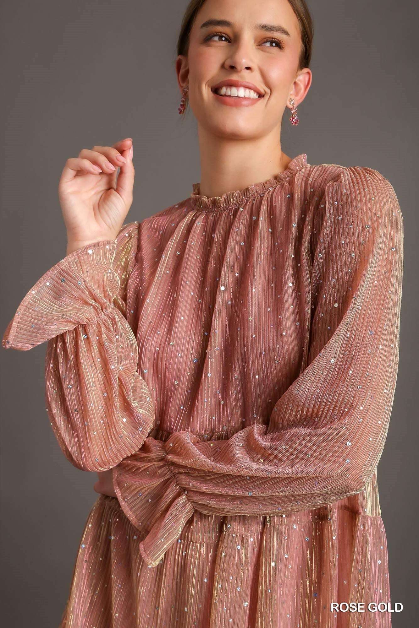 Get ready to turn heads and make a statement with our Metallic Pleats Shimmer Tiered Dress in Rose Gold. Add it to your cart now and experience the perfect blend of fashion and glamour!