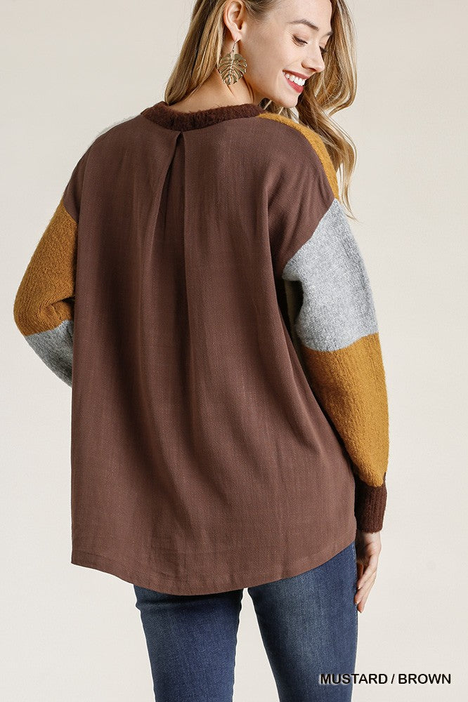 Colorblock Contrasted Cotton Fabric On Back Top With Side Slits And High Low Hem
