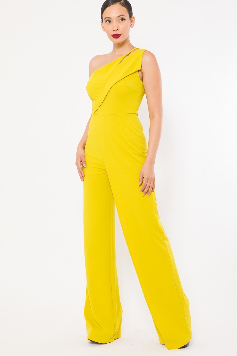 One shoulder jumpsuit w/ small opening. Frontline Flared Leg Design, Back zippe